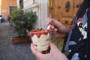 After we were full to the brim we remembered there’s always room for dessert so we wandered up a few alleyways to Zum which is a shop which sells all different flavours of tiramisu. We chose strawberry. The strawberries were juicy and sweet and the marscapone cheese was the richest we’ve had. It was difficult to get through after the pizza and with the heat bearing down in us but it was yummy none the less.