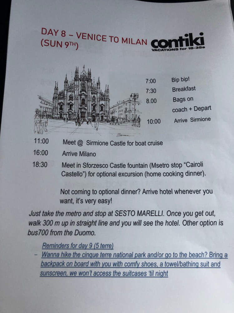 After lunch we got on the bus to drive to Milan. It was only about an hour and a half drive. We arrived at 2:30 and had just 40 minutes to get ready to get dropped into the city before our optional dinner. Ronnie and I are used to these tight time constraints on contiki but it’s tough when over forty people has to get their luggage into their rooms. It can reduce refreshing time to 15 minutes.
