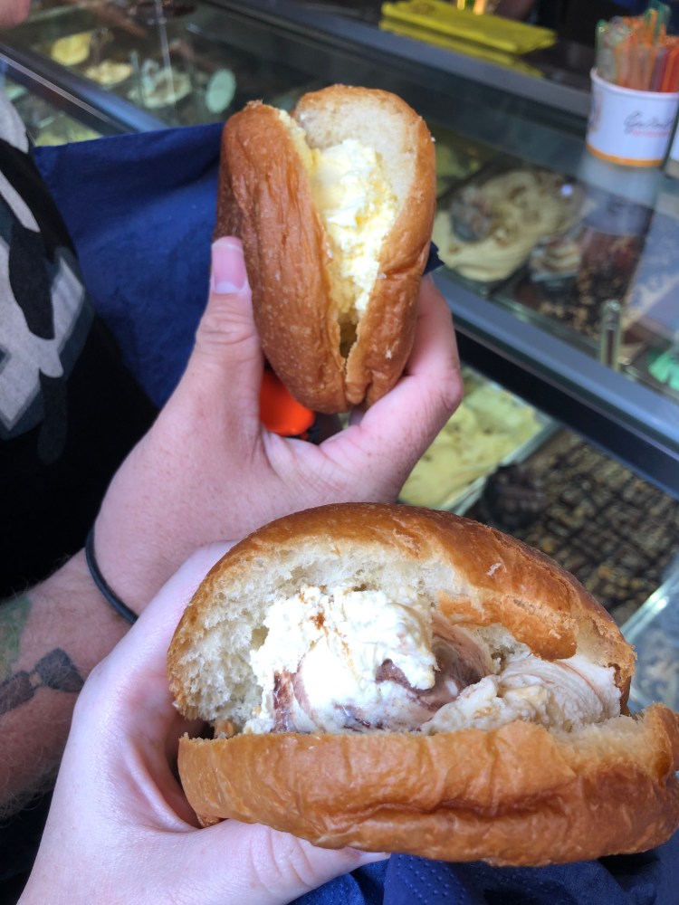 We had an hour to spend in Sirmione before our private lake cruise. Jimmy suggested we get a gelato brioche sandwich so of course we did. I got caramello gelato and Ronnie had vanilla (adventurous…haha). The sandwiches were delicious – creamy gelato and sweet brioche rolls, yum.