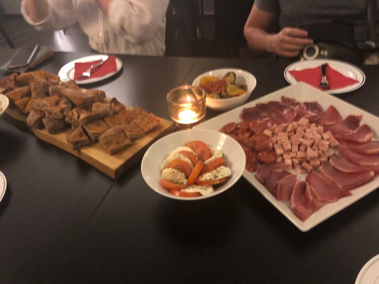 Our optional dinner tonight was in a chef’s home. The chef was on Masterchef. We walked in and he had a nice kitchen setup with a little dining room with art around made with balsamic vinegar and olive oil. We started with antipasti – cured meats, picked vegetables and cheese. It was salty and tender and creamy.