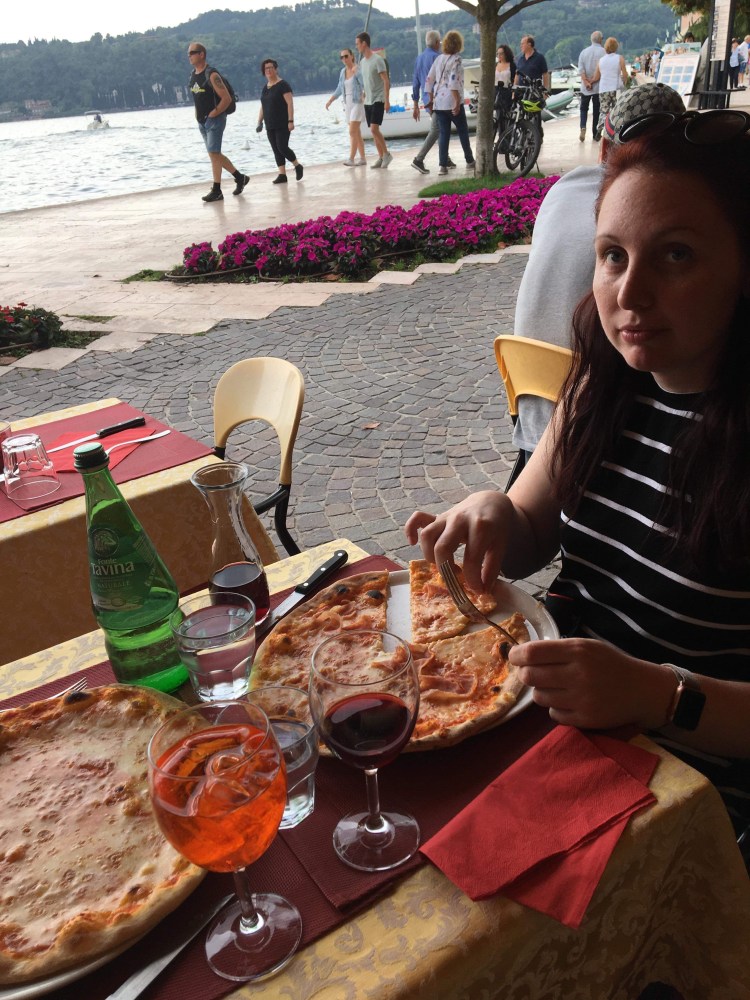 When we arrived in Saló we had 45 minutes for lunch. Ronnie and I sat down for pizza that Jimmy recommended. We didn’t realise the size of the pizza when we ordered so we ordered one each – margherita and prosciutto pizzas. Well they were huge! Ronnie had a spritz and I had some house red. It was all delicious. The pizza had a great tomato base and the cheese was salty and tasty. Ronnie added chilli oil to his and liked that addition.