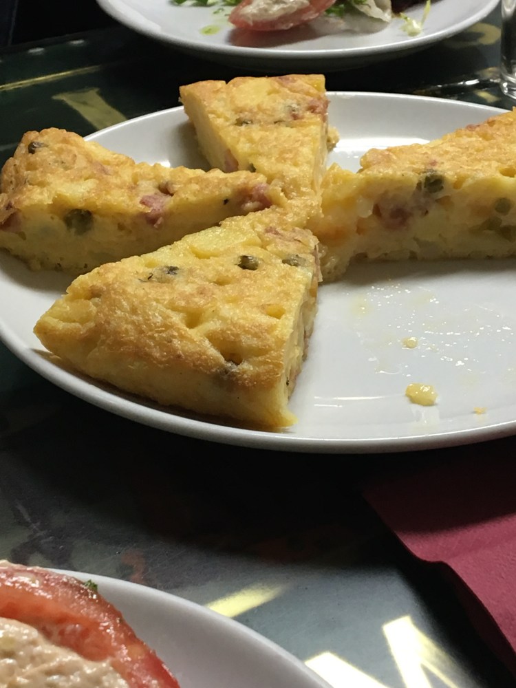 Our final food stop of the night was at La Casa de las Torrijas and there was a little area with a table reserved for us. We had lots of food here and we failed to get through all of it. We were presented with what looked like just a full tomato to be shared between two people but when you cut it in half it was filled with a tuna belly mousse. I don’t normally like tuna, I never really it at home because I prefer salmon but I ate all of my half. It was light and fresh. Ronnie only had one bite. He didn’t mind the tuna but doesn’t like whole fresh tomatoes. We were then served a Spanish omelette which is a mix of potatoes and egg and this one had veggies and onions but they don’t always feature in this dish. It is cooked in a very precise way to keep the omelette soft in the middle but not raw. Ronnie loved this dish the most. For such simple ingredients it really was tasty.