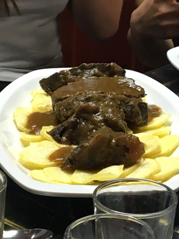 Our third food stop was at La Casa del Abuelo. At this bar the menu is just written on the windows or mirrors. We were given a sweet summer wine, a red, which was too sweet to be drank on its own but it was meant to be paired with the bar’s specialty which is Gambas al Ajillo. Gambas is prawns and Ajillo is garlic so it was sizzling garlic and chilli prawns. Well they were delicious. The prawns were soft as they were so fresh and the sizzling garlic and chilli oil was so tasty because of how high quality the oil was. The wine was easier to drink paired with the prawns. We soaked up the oil with the bread, we couldn’t hold back despite a sit down meal to follow. So far the bars we had gone to were standing room only. There is no such thing as personal space in Spain but in a fun way. You have to use your elbows to create some space to get to the bar.