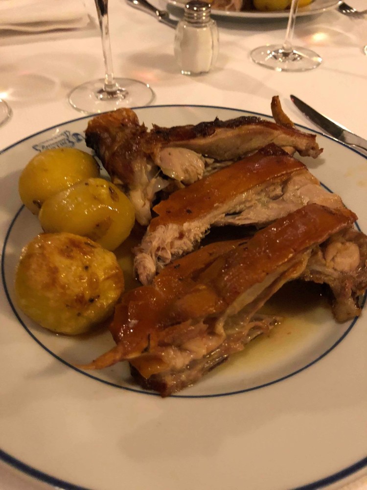 Now more about our lunch destination. This is Aimee taking over to talk about the food, of course. We had seen YouTube videos about what is considered to be the oldest continuous running restaurant by Guinness Book of World Records and it just happens to be in Madrid so we made a reservation there for today. It’s called Botìn, it opened in 1725 and its specialty is roast suckling pig. We were asked whether we preferred to dine upstairs or downstairs. We wanted to dine downstairs in the cellars so we walked down a steep staircase to be seated. We ordered sangria, a portion of the roast suckling pig each (had to go with the specialty!) and bread to soak up the meat juices. Our sangria arrived which was very sweet and we sipped on it while waiting for our food.