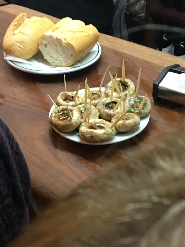 It was hot out and we walked past the bar with the mushrooms we went to on our food tour and decided to go in for a refreshing tinto de verano. We were not hungry in the slightest but the bartender talked us into getting a plate of the stuffed mushrooms and there is a sign in Spanish in the bar that literally says you can’t leave without trying the mushrooms, so we obliged. Well the drink was delicious and the mushrooms were just as good as the first time. It was cheap and we wish we had made this our first choice for lunch.