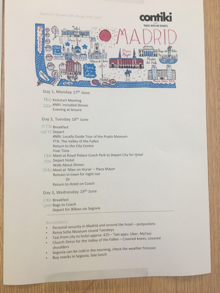 Hola readers! It is currently 8:30am and we are on the coach on our way to Segovia. We just had our last day in Madrid (for now) as well as our first day on Contiki.