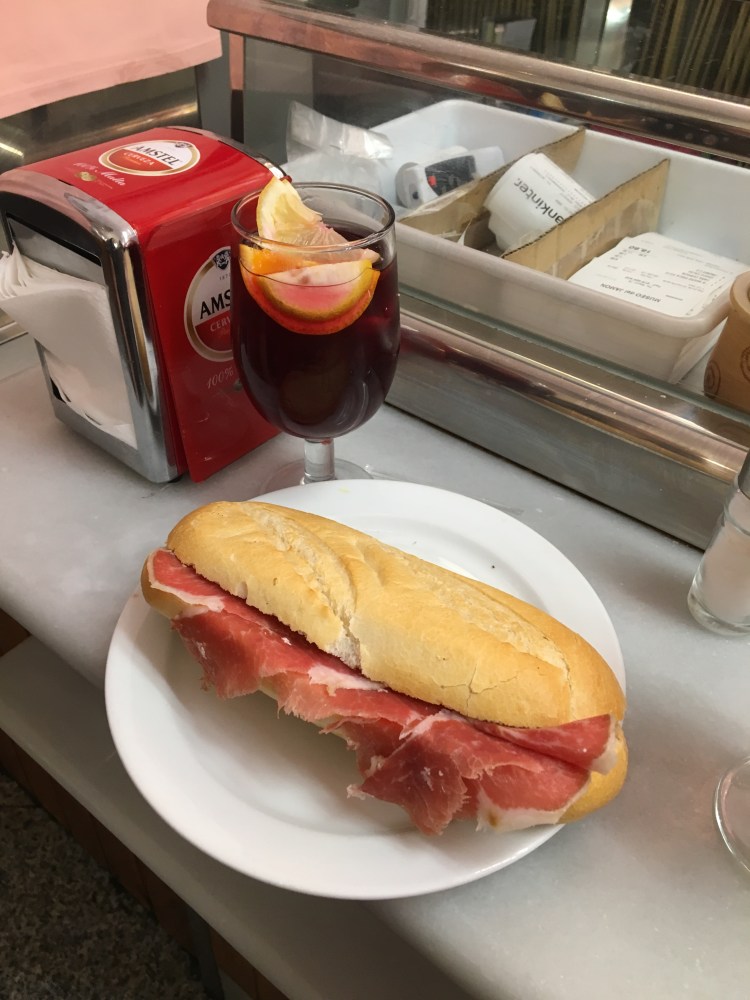 We were still pretty full from lunch so we grabbed a lemonade from Mercado de San Miguel and then we went to a place called Museo De Jamon (transalation: Museum of Ham) which isn’t actually a museum, it’s kind of like a deli/bar. We got Jamon Iberico sandwiches and a glass of sangria each. Jamon iberico is like prosciutto but it’s a special sort of pig that is raised in a special way – Jamon Iberico in Australia is about $600 a kg – not cheap. Cheaper here though and really nice! It was a light dinner but we needed that.