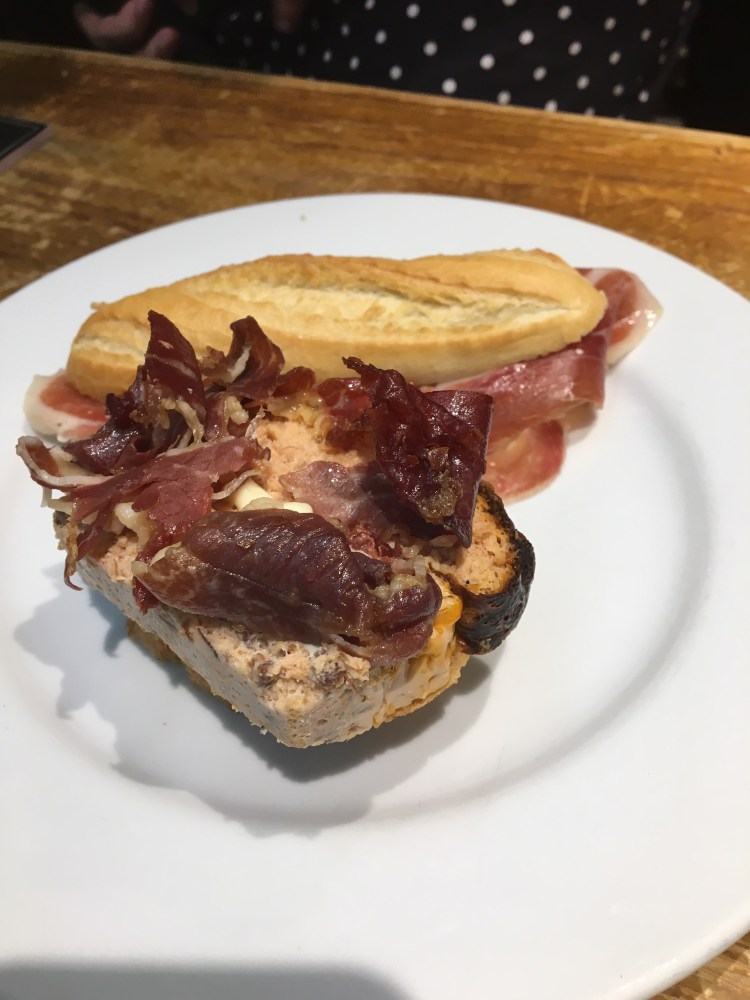 We sat down at a little table in the crowded bar to try out food and drinks. Ronnie then discovered that what he thought was bread was some kind of pâté which was covering the actual slice of bread and it was topped with ham and mayonnaise type sauces. He tried it but didn’t like it. He said his drink was good but he preferred red wine on its own. My jamon baguette thing was pretty tasty but not too adventurous. The cider was not like cider I’m used to drinking but it was alright. It’s a flat cider which they pour from height to get bubbles in and it was not sweet at all. We thought the bar was pretty average so decided to move on.