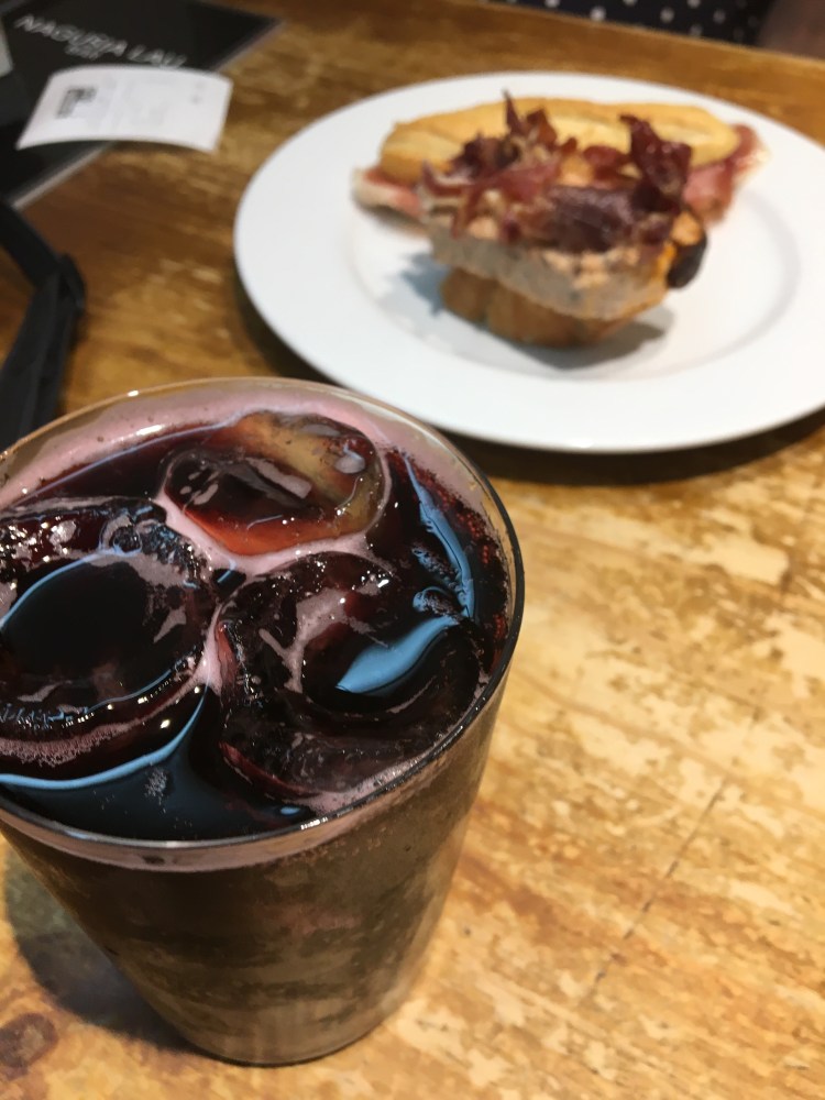 We received our drinks and food at the bar and ate standing there as you do in Spain. Well the risotto was as amazing as the reviews said. It was rich and cheesy, made with Basque sheep’s milk. The orzo, which is little bits of pasta, was perfectly al dente. We could have ordered much more of the risotto. The pork rib was tender and juicy and had a sweet sauce on it. It was delicious but the risotto was the star. The drinks were refreshing. I love a tinto de verano much more than I like sangria.