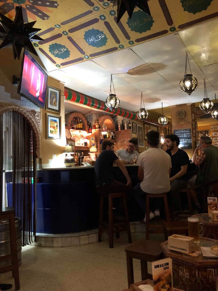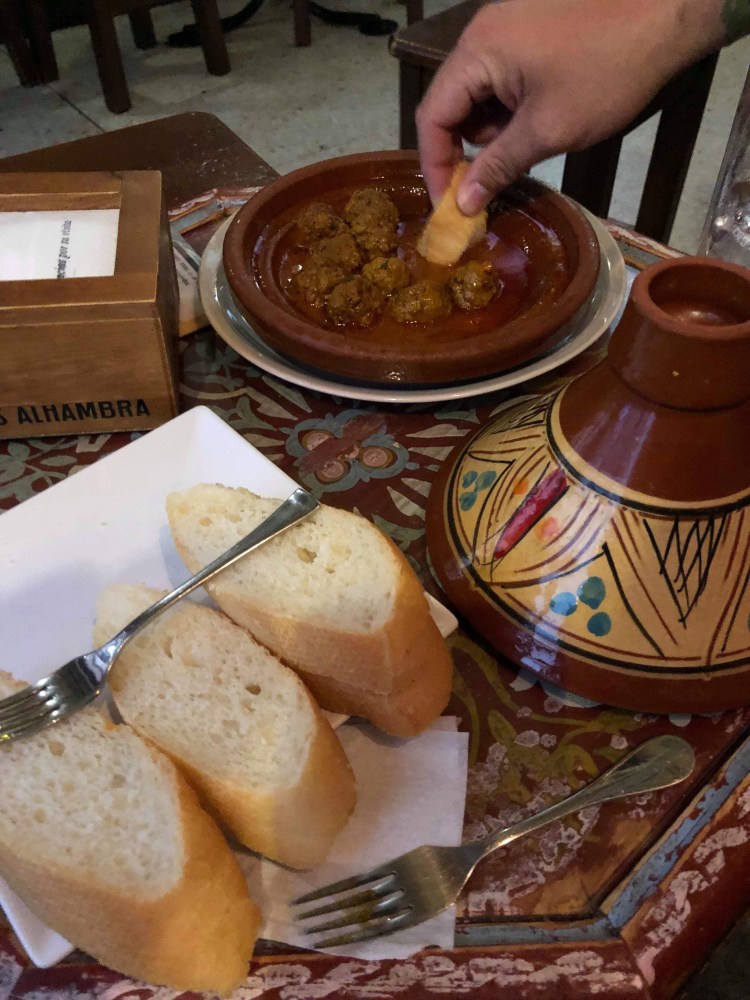 We were hungry after a bit of a wander. The best thing about Granada is that when you order a drink in a bar you get a plate of free food. Granada is pretty close to Morocco therefore there is a lot of Moroccan cuisine and we wanted to try it. We found a Moroccan tapas bar and ordered a drink each.