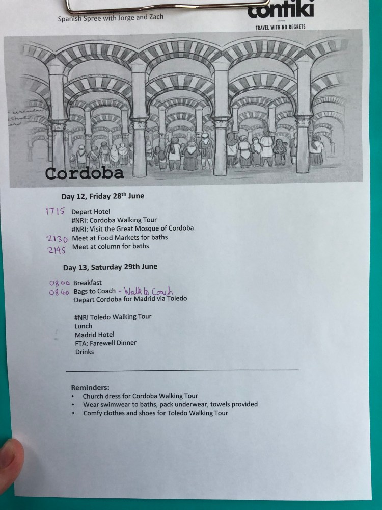 It was about a 2 hour drive to Cordoba so it wasn’t bad at all. The problem was though that I was feeling pretty sick by this point and the temperature was up to 41 degrees. Where the bus dropped us off we had a 5 minute walk to our hotel with our bags in the sun that was actual hell. We got into our hotel and we had 45 minutes to freshen up and Zach was going to take us on a walking tour. oh fuck no. We decided to skip the walking tour. It was way too hot and I was feeling horrible. We turned our aircon on which unfortunately was not great and caught up on the latest two episodes of the Handmaid’s tale – what a great show. We also got a little kip in here.