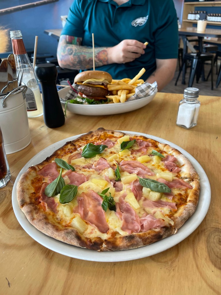 We decided to head back up the coast slightly to Bicheno where we were staying for the night. It’s a small town with limited food options but we spotted a cafe called Food & Brew and settled on it for lunch. It turned out to be quite decent. The man serving there was super friendly. They did wood fired pizza so I still got a pizza and Ronnie went with a wagyu beef burger because he was craving a burger. It was all yummy and hit the spot.