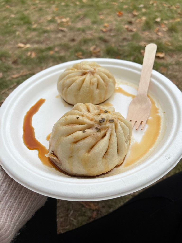 We started our evening of eating with baozi or steamed buns. We got a beef bun and a pork bun to share. They were alright. Not bad, not the best we’ve had. While I was waiting in line for the buns Ronnie went off to surprise me with another tasty treat. We met on a grassy spot on the lawn and Ronnie had brought back a chicken and chorizo paella and patatas bravas. In no way was the paella traditional but no matter because it was really delicious and the patatas bravas were hot, crispy and had the right amount of sauce on them.