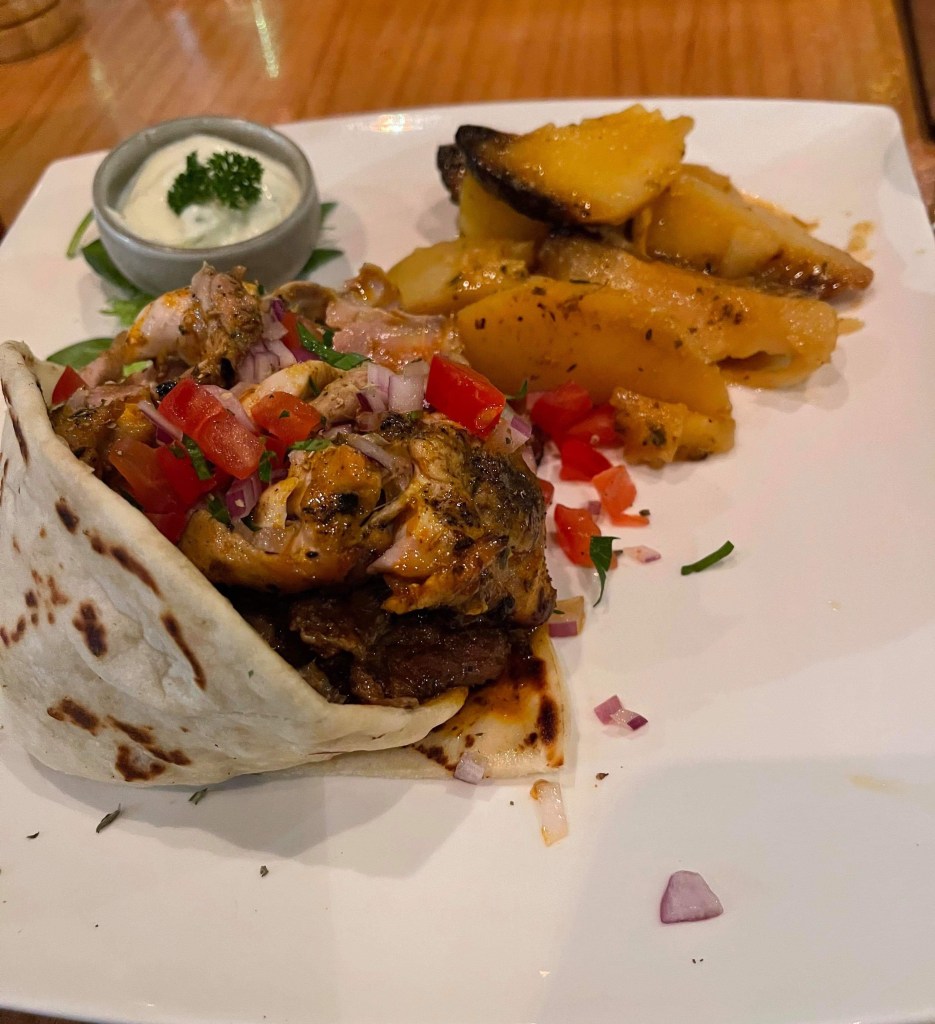 We then moved on to our mains. Ronnie was served a Cretan mix of chicken and lamb in pita bread with a side of lemon potatoes and tzatziki. I got lamb mince skewers with pita bread, sidewinder fries, a tomato and onion salad and two sauces, a cold napoli sauce and a creamy mint sauce. The mains were scrumptious too.