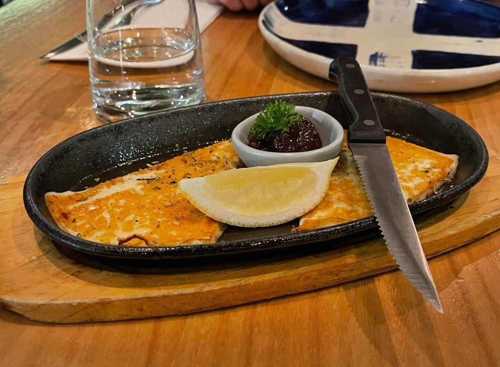 Our dinner this night was at Urban Greek, obviously with Greek cuisine. For drinks, I ordered a local pear cider and Ronnie got a house-made lemonade. Very refreshing. We decided to share an entrée which was saganaki cheese with fig jam. Saganaki cheese is a Greek cheese similar to haloumi and paired with the sweetness it was a delicious combination. We both enjoyed this and Ronnie said it was one of the best dishes he had while we’d been in Tasmania.