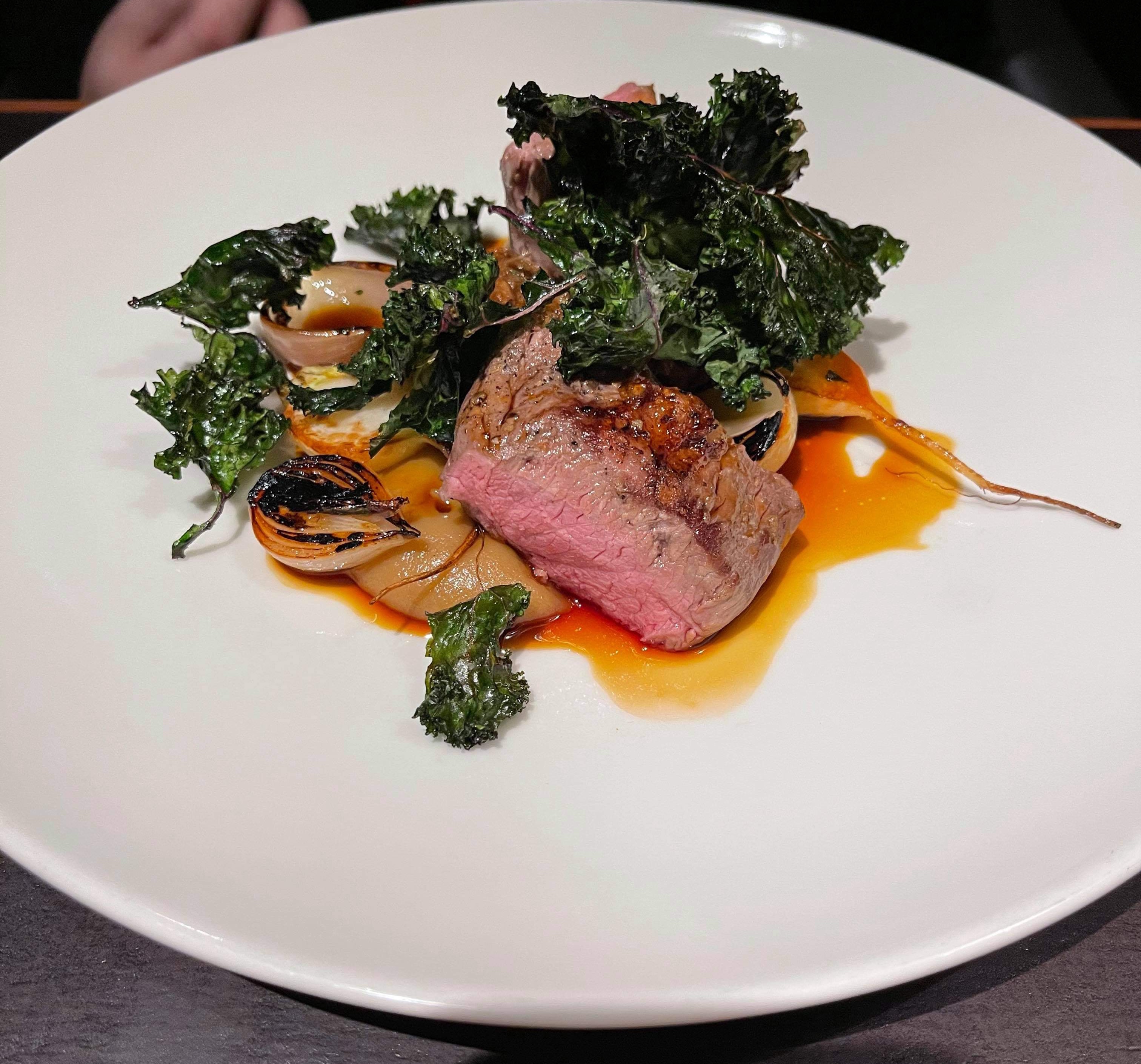 We waited a little while with a lot of other cars for the next ferry nervous we’d have to wait another half an hour for the next one. We made it on though in prime position for a nice ride back to mainland Tasmania and drove back to our accommodation for a nice rest before dinner. We watched Lord of the Rings, packed our bags and napped before dinner. Our dinner was a late one at 8:30pm. We had a reservation at Landscape Restaurant & Grill after reading the excellent reviews online. It’s a restaurant that is kind of a gallery on it’s own as it shows landscape art from a Tasmanian artist called John Glover. We arrived and immediately knew we were in the fanciest restaurant we both had ever been to. All of the waiters were in suits, wine was being decanted on a bench nearby and the vibe was just super fancy.