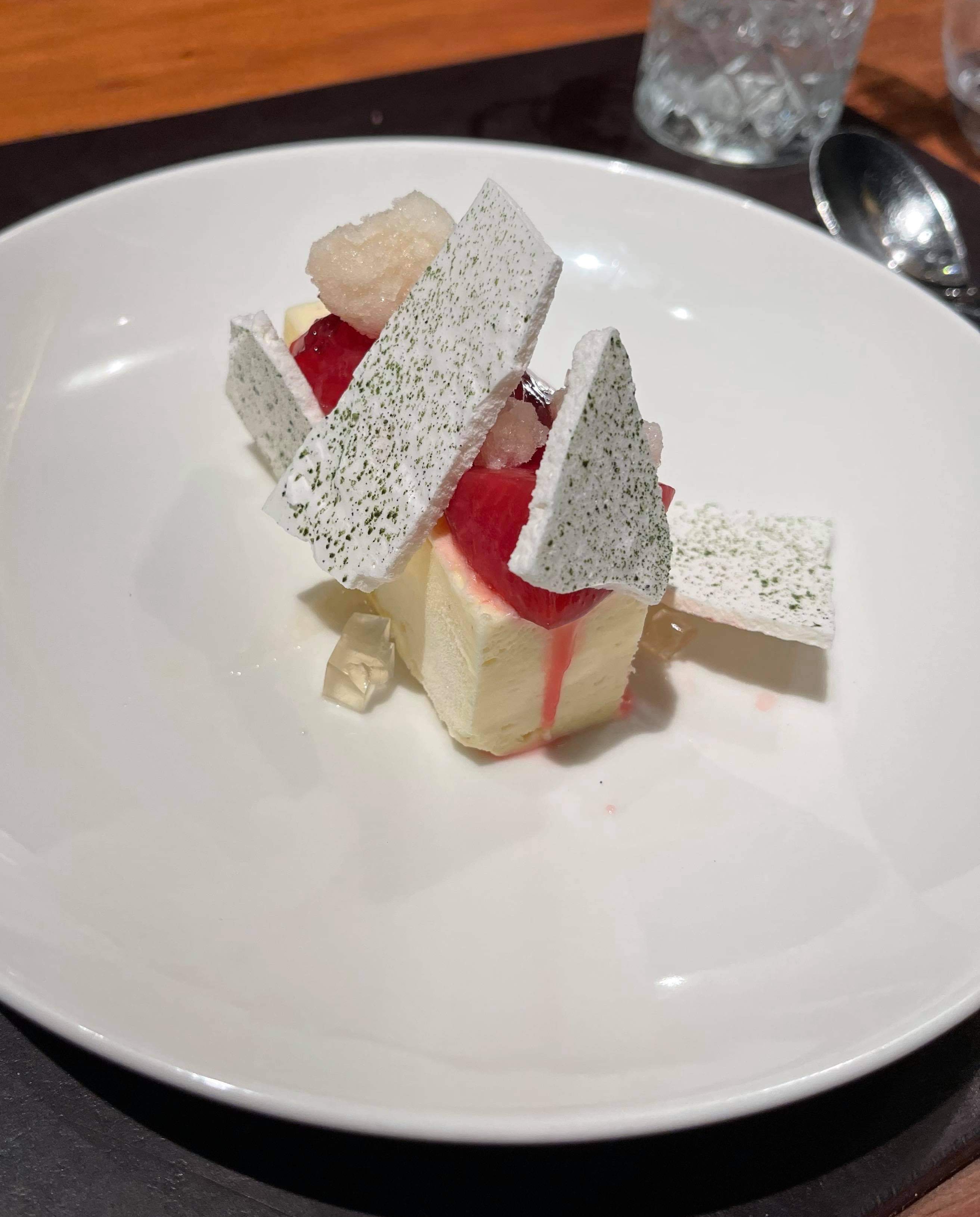 I had been wanting this dessert on the menu since I first looked in online a while ago. It was smoked honey ice-cream and on the menu online it said it came with an apple, walnut and ginger sponge, but this night it was being served with a crumble and roasted figs. I still ordered it but I’ve discovered I really only like figs in jam form. The ice-cream was pretty good. It wasn’t the dessert I thought it would be but I’m glad to have tried it. Ronnie tried the mascarpone parfait with plum, lemon verbena (a flower?) and green tea meringue. Ronnie very much enjoyed his dessert and was happy with his choice.