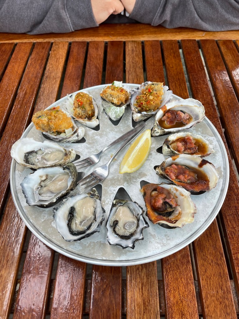 We then went off to our final food stop of the day and the one we were most nervous about. Being from inland NSW we don’t typically eat oysters. They’re not something we were introduced to growing up and we never considered ordering them on any menu before, but Bruny Island has a well known oyster shack called Get Shucked and we wanted to try them. Ronnie was nervous that they would be slimy and hard to get down and he only intended on eating Oysters Kilpatrick. I wanted to try at least one natural. They offered a mixed dozen of oysters with three different types – Asian fusion, Kilpatrick and Natural with four of each kind. We got this to share. It was a long wait for the cooked oysters and after we’d waited quite a while we were wondering if it was really worth it, but let me tell you, we walked out of there raving about them.