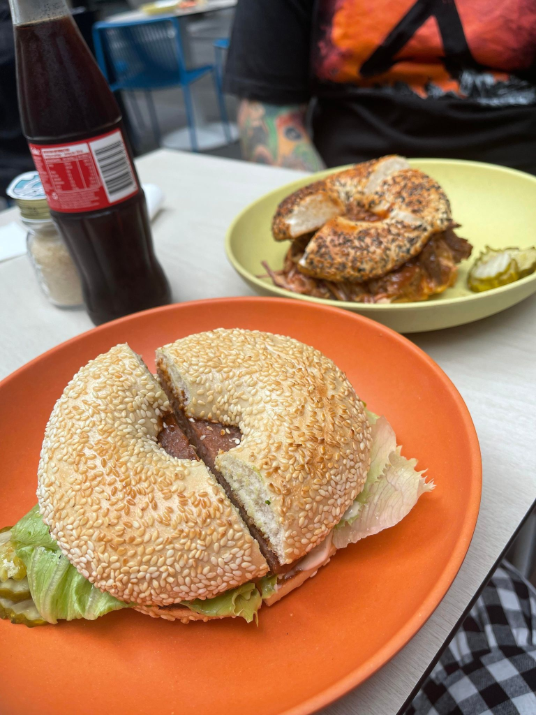 After we finished our coffees we jumped on the tram and headed to where we were eating breakfast today – Schmuck’s Bagels. Ever since we were in America and first enjoyed bagels for breakfast we have always appreciated them as a good breakfast option. It is underrated and Australia hasn’t really embraced the Bagel brekky. We are massive fans of the classic bagel with cream cheese, but as we were at a proper bagel place we decided to go for more involved options. We ordered two bagels, the Oy Vey bagel which has slow-braised pulled pork, harissa slaw, tonkatsu, crackling salt on seedy grain and the Seb which was sausage & egg, kewpie mayo and iceberg on sesame.