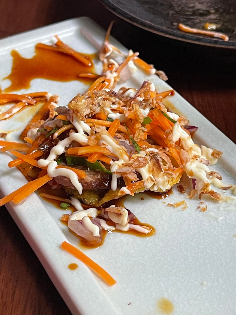 In between the shows we had about 3 hours. We made a reservation at a very popular and trendy Vietnamese fusion restaurant around the corner from the theatre called Hochi Mama. They had really cool decor, good music and a good atmosphere inside. The servers also used iPads and we always find it professional when restaurants take orders this way. They have a deal where you get two entrees, two mains and a side which we ordered. For our entrees we ordered Rice Duck Crisps (pictured) and Steamed Pork & Prawn dumplings.