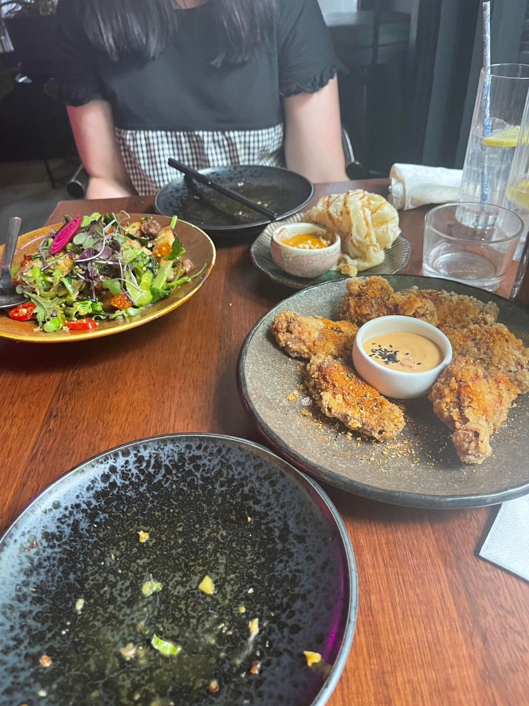 The duck crisps were delicious. It was roast duck, herbs, fried shallots and special sauce on a fried wonton. The wonton was crunchy and the flavour all worked. It was a really great entree. The dumplings were as advertised, just dumpling which are always awesome. Looking back it was a pretty safe choice and we probably should have been a bit more bold but it did the job. For the mains we ordered Hochi Fried Chicken and Chinese Broccoli Stir Fry which came out with our side of Roti with peanut satay dipping sauce.