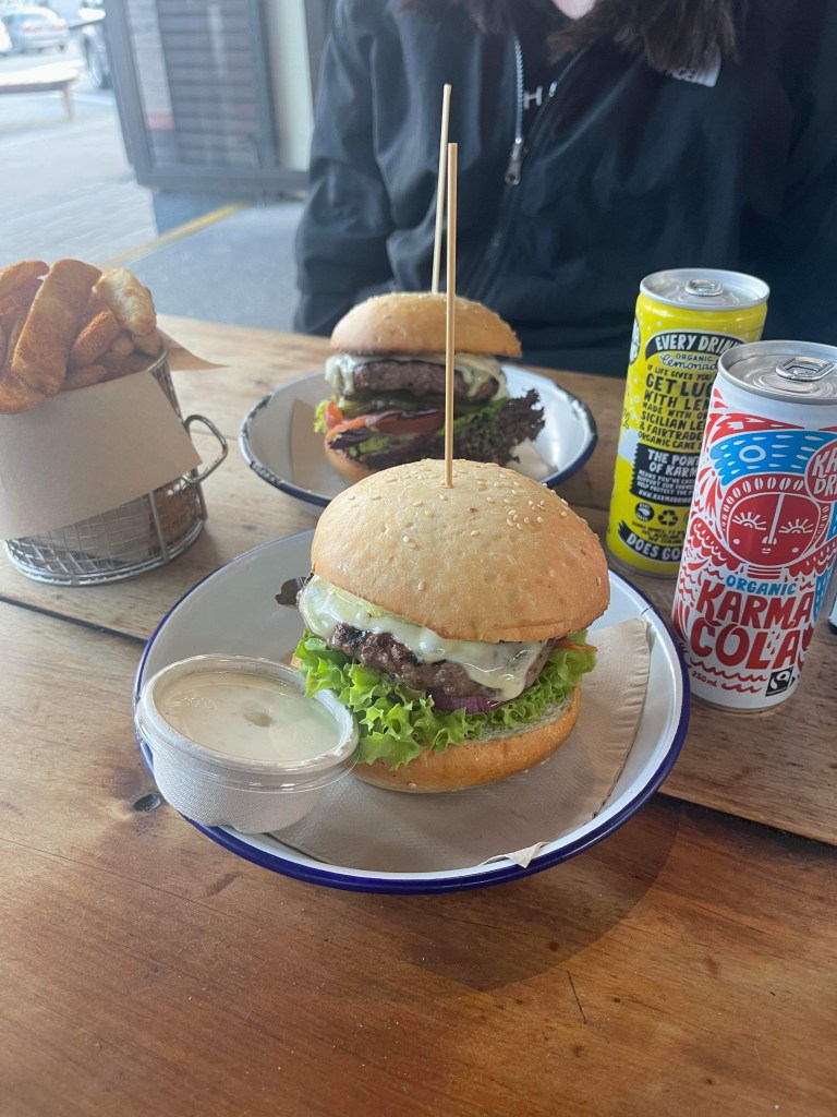 We then wandered to a bar, sat down for a drink to soak in the lovely fresh air , sun and views. We then went to Patagonia Chocolates to grab some dessert for later. We’d already chosen our dinner for the night and headed there next. We went to Red Star Burger. Ronnie had the BBQ which is a beef burger with Swiss cheese, pineapple and smoky BBQ sauce. Aimee had the Mac with beef, Swiss cheese and gherkins. We both really enjoyed our burgers. The sauces on the burgers were so tasty and they were super juicy. We shared a Cajun fries which were spicy but yum. To drink we got organic cola and lemonade. These weren’t the best.