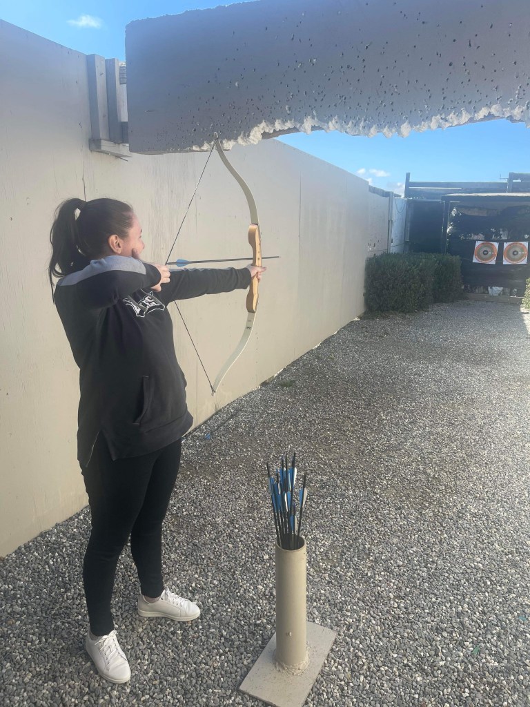 We started off with the archery which was fantastic. They had three different sizes of bow and a stack of arrows. We got to go in together and the guy said we can fire arrows for as long as we want as nobody else was there. We spent about half an hour improving our archery skills. This was really very fun and was the first time either of us has shot a bow. Ronnie definitely won this. Aimee’s first arrow went into the bush.