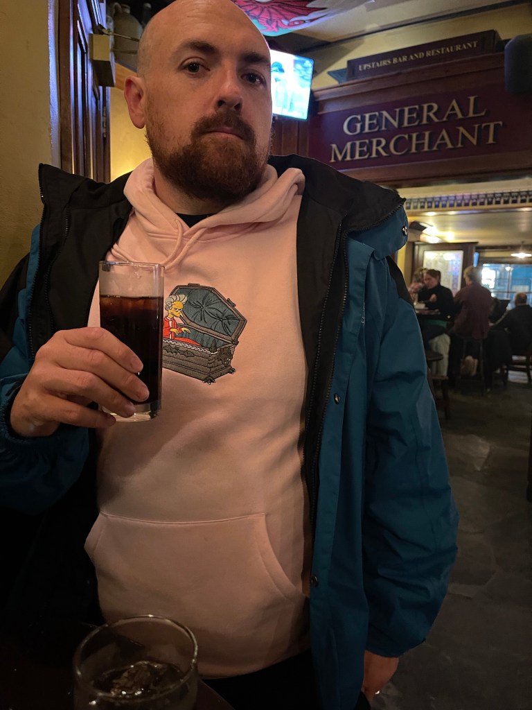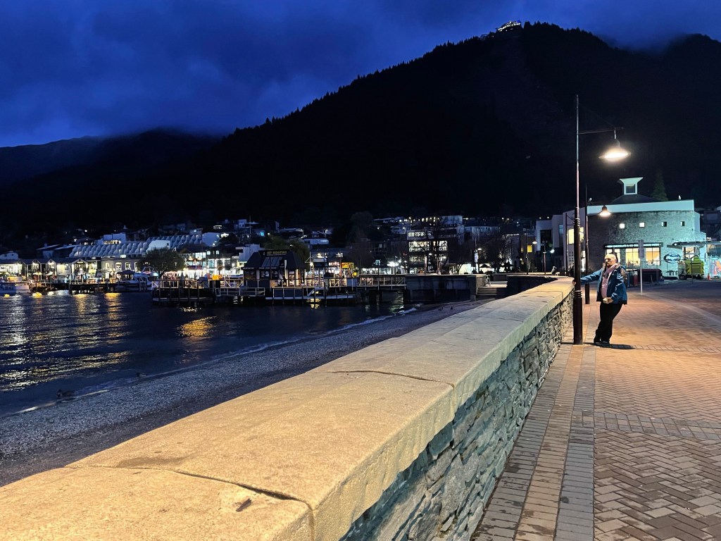 We still had a little bit of time before dinner so we walked along the boardwalk and took a few last pics of QT and stopped by Patagonia to get a few more chocolates that we would eat on our road trips and over the next week or so. We got a milk chocolate and hazelnuts, milk chocolate and rice bubbles, an Alfajor biscuit another chocolate but we can’t remember what it is. We also had a bit of time to go for a drink at this cool Irish pub right next door to Patagonia called Pog Mahones. We had a quick drink in there and watched the musician play who was good. It would have been nice to spend more time here but we had a dinner reservation.