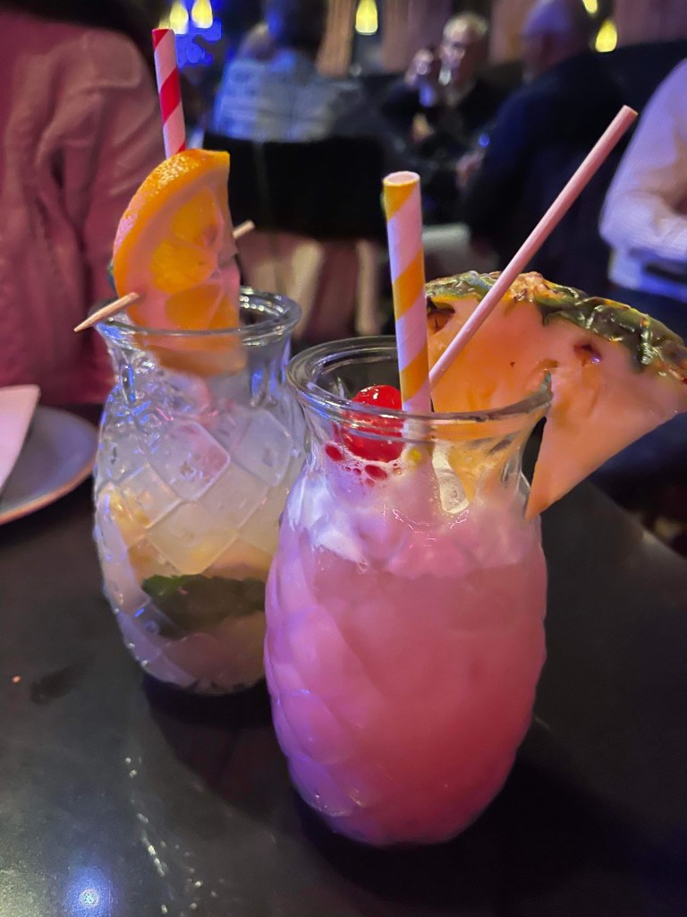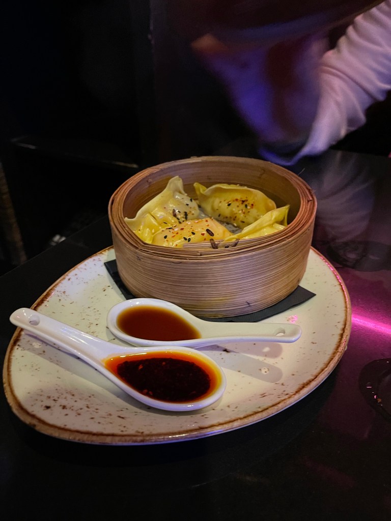 We went to our dinner at a place called Blue Kanu. Blue Kanu is a fusion of Polynesian and Asian cuisine that they called “Polynasian”. We ordered a few drinks and a few small plates. First we had the prawn and ginger dumplings which came with chilli oil and Unagi sauce.