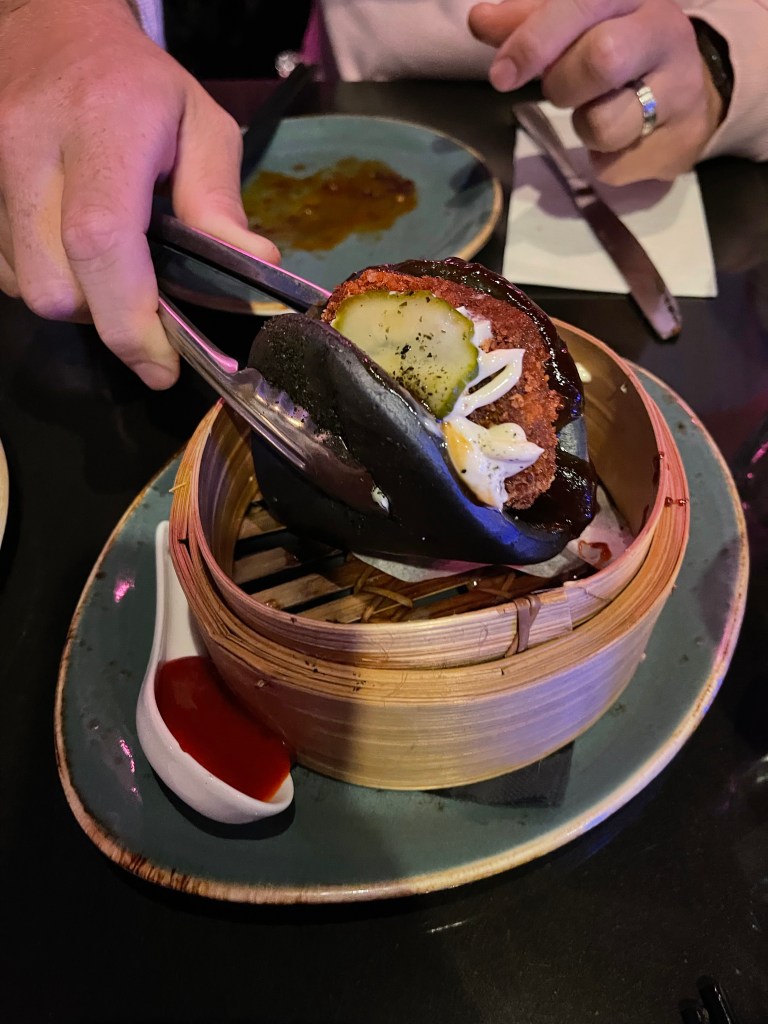 They were pretty decent. They were steamed with a nice and soft interior with that nice ginger hit. Then we had the steamed charcoal goat rendang bao bun with hoisin, pickled cucumber and fermented chilli.