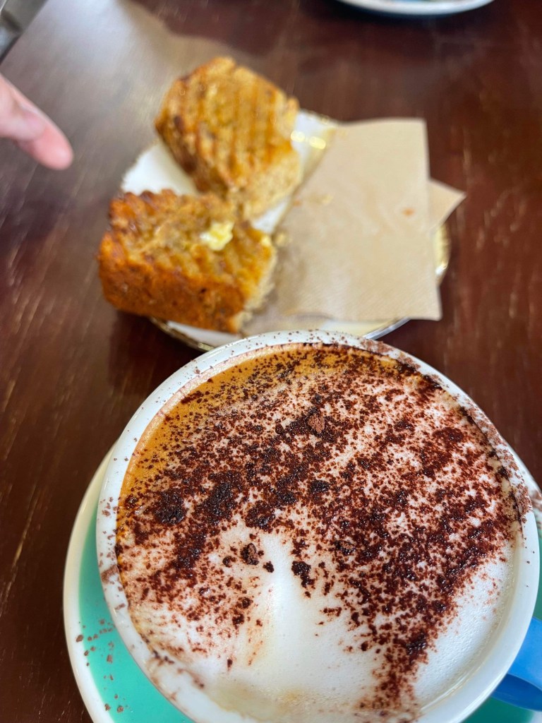 We sat down at the only cafe in town and had a coffee and shared a slice of banana bread for breakfast which was really quite yum.