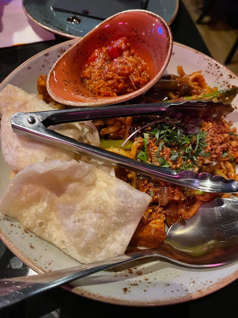 We didn’t know what to expect with this one. It actually turned out to be delicious though. The bao bun was soft and tasty, the meat wasn’t too strong of a flavour and was actually quite light and there was plenty of sauce. It was quite good. For the main we shared a Mi Goreng noodles, tofu, shiitake mushrooms with a tomato and coconut sambal and wonton crisps.