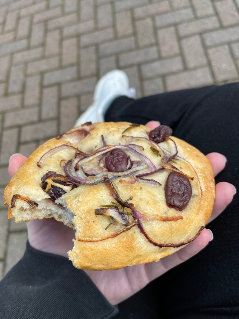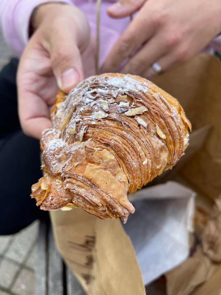 We braved the cold to sit outside and eat our lunch we purchased earlier. We ordered tomato and pesto focaccia but we ended up with olive and rosemary focaccia. Ronnie doesn’t like olives so he didn’t eat his. He ate the plain and almond croissants and really enjoyed those. Aimee ate the focaccia as she likes olives and it wasn’t too bad.