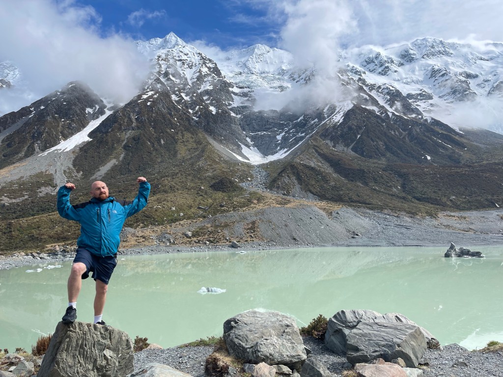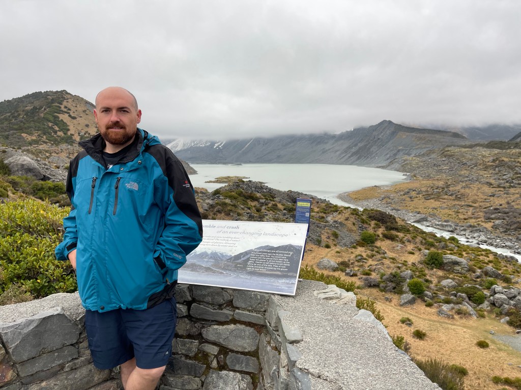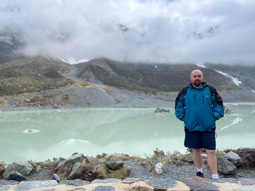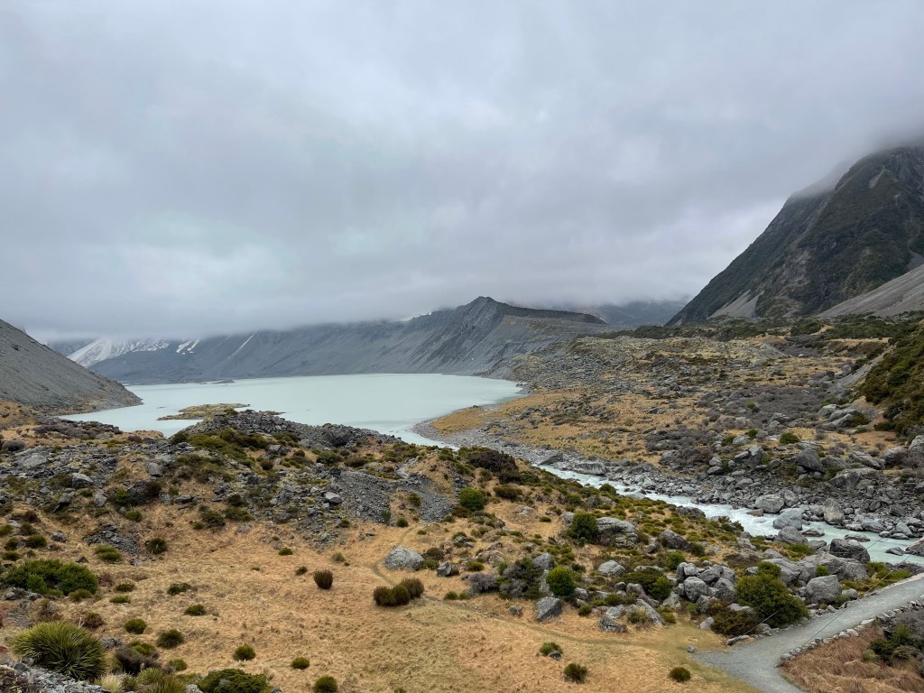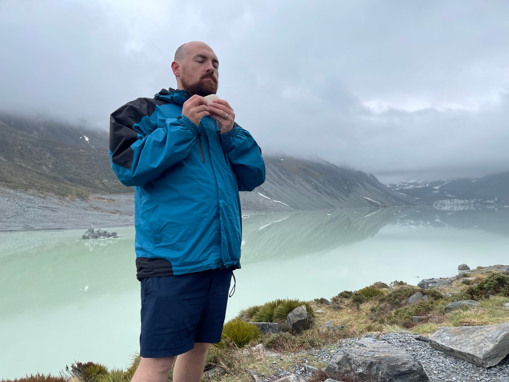 We eventually made it to the 5 kilometres halfway point. This is where the reward was. We were met with what is supposed to be views of the highest peak in NZ Mt Cook. However, we were met with a nice lake with little icebergs in it and thick grey cloud. It was still nice so we weren’t too upset, just a little underwhelmed. We had brought our lunch to eat here. A cheese an onion sandwich (weird! And not nice), some sweet chilli chips and a cookie time cookie. The chips and cookie was delicious.