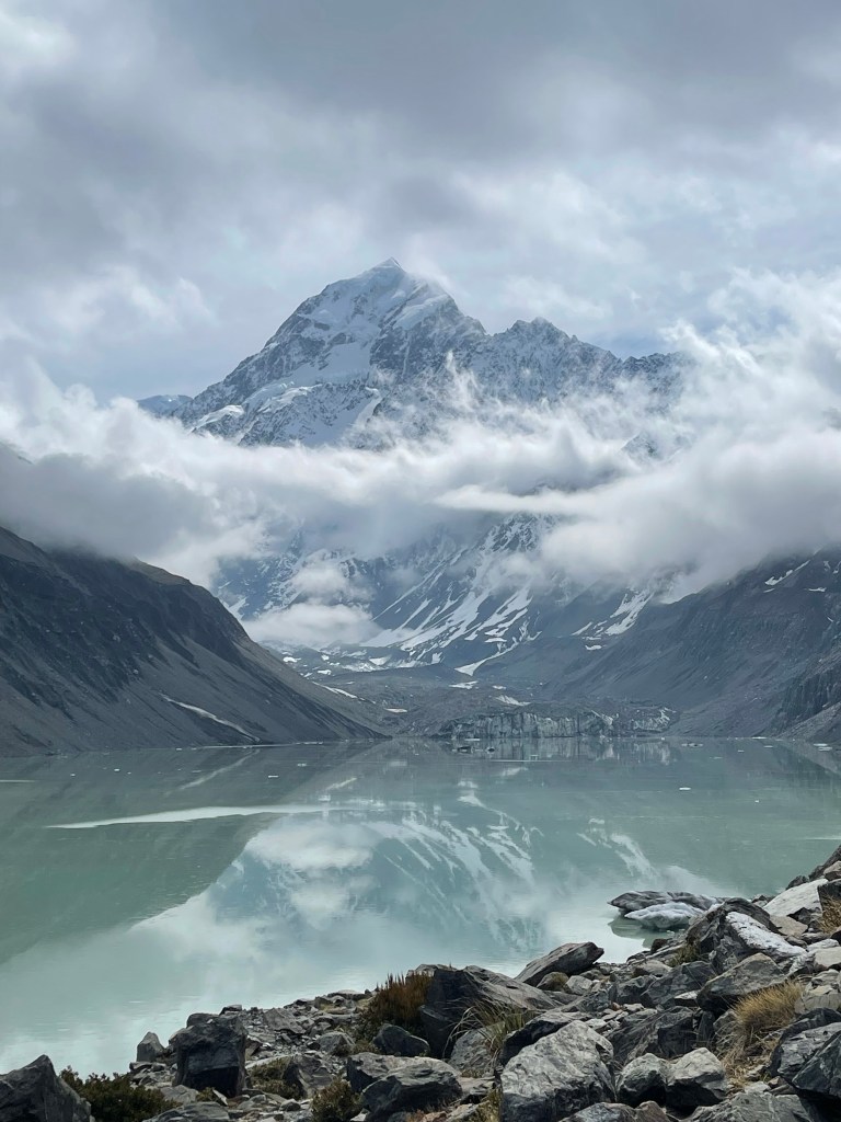 It was at this moment just after lunch that the heavens parted. The cloud started rapidly dissipating and we were rewarded with one of the most beautiful views we have ever seen. Mount Cook emerged from the clouds along with the surrounding mountains.