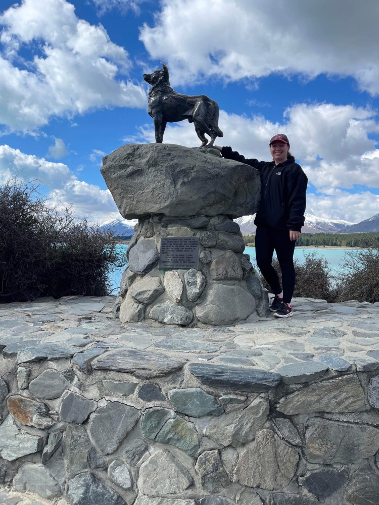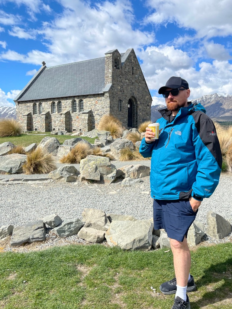 We got back to Tekapo and grabbed some stuff from the Four Square for dinner tonight and then ducked over for another photo opportunity at a place that is very popular for this – The Church of the Good Shepherd. It is a little church that sits on the lake and looks beautiful in the setting. There was also a doggy statue here that Aimee wanted to get a picture with.