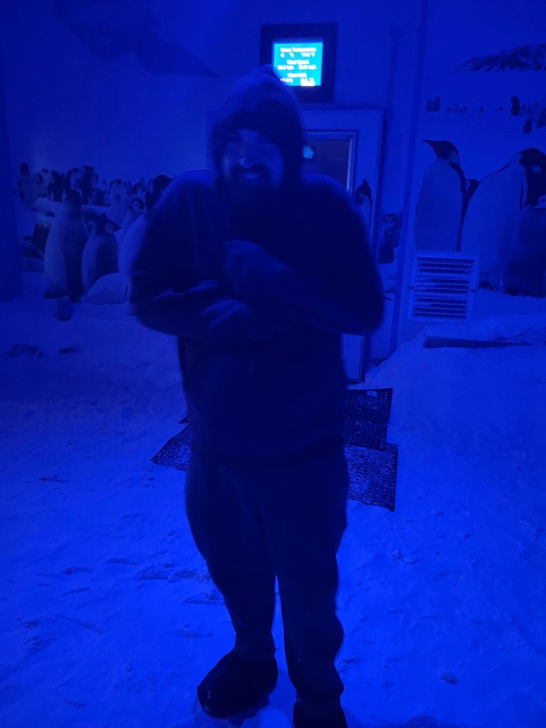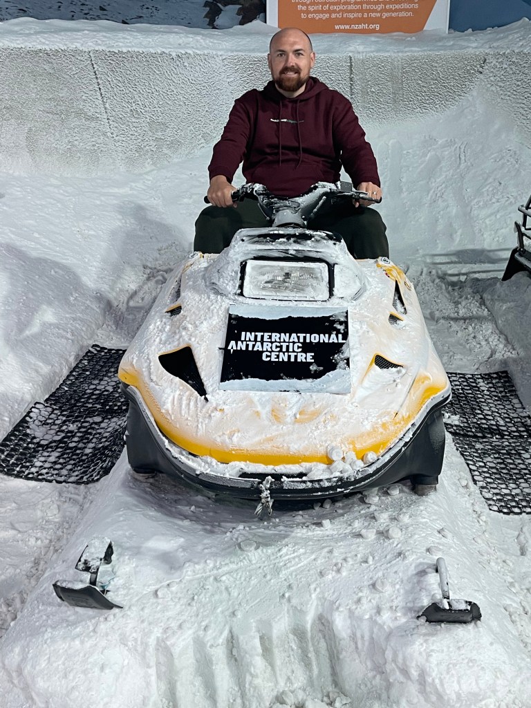 After we were finished with breakfast we drove over to the International Antarctic Centre. It is a museum with lots of facts about Antarctica but it also has a hagglund ride, Antarctic wind storm simulator, snow dogs to meet, penguin viewing and 4D theatre. Ronnie went on the hagglund ride and said it was alright. It was a ride in a vehicle they use in Antarctica over hills and bumpy terrain.