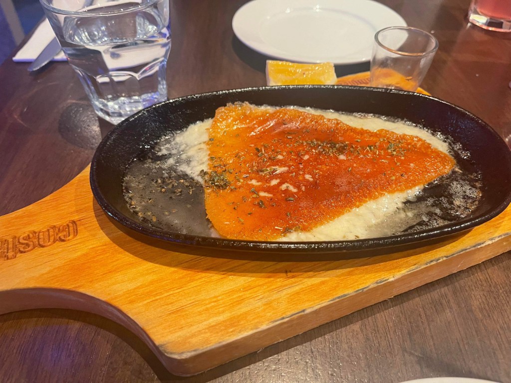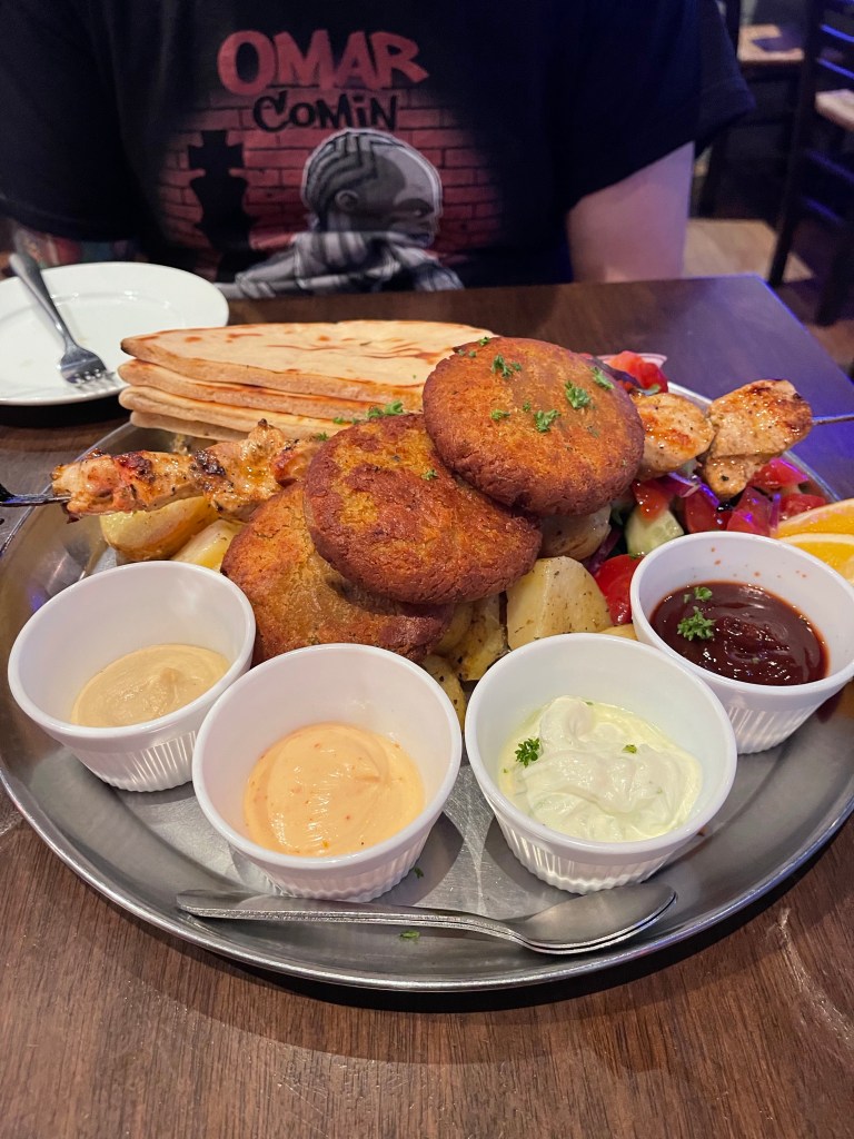 When we were there we got some pink lemonade flavoured greek sodas, flaming saganaki and a chicken and falafel souvlaki platter. The flaming saganaki wasn’t great. It tasted like melted cheddar cheese. The platter was pretty nice with good sauces and yummy pita bread. The falafel was crispy and had good flavour.
