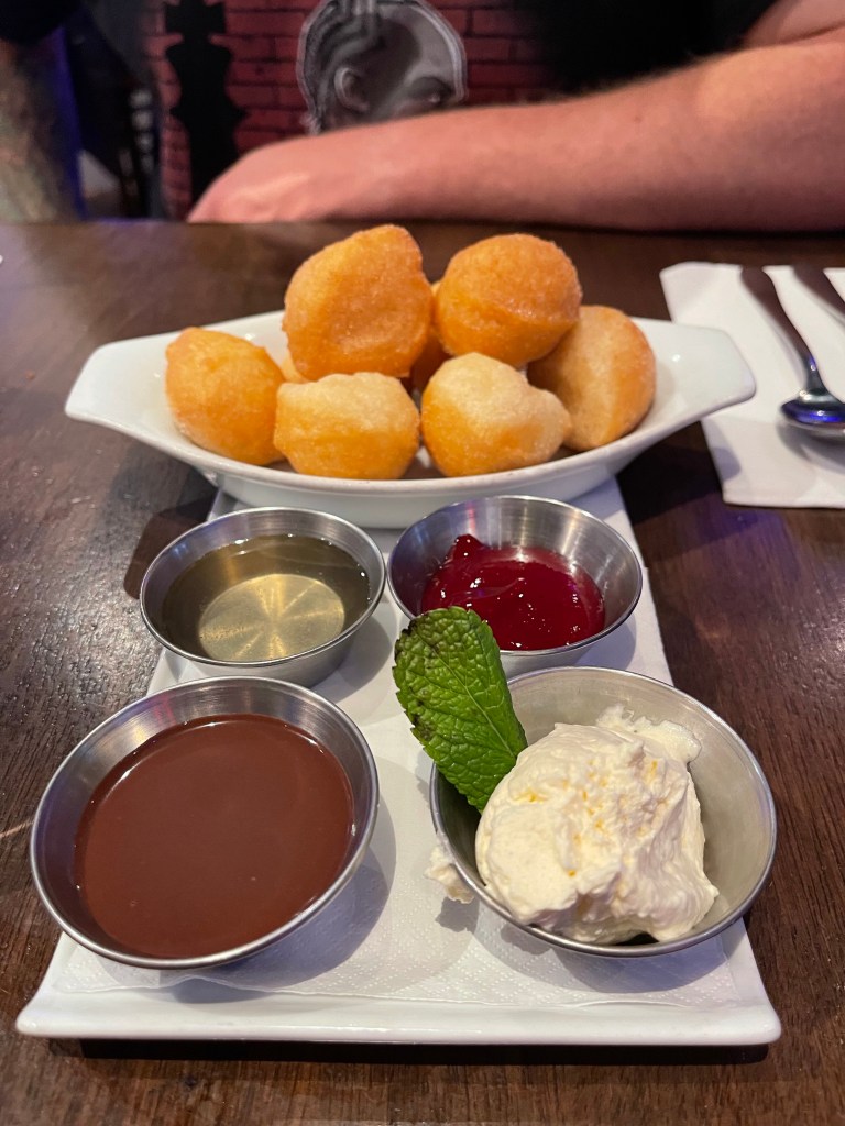 We finished the meal with a dessert called Donuts of Olympia which were Greek donuts (loukamades) with three sauces and cream. Greek donuts are always delicious as they are crispy on the outside and airy in the middle. These ones were delicious despite not being the best ones we’ve had. They are divine when they’re done perfectly.