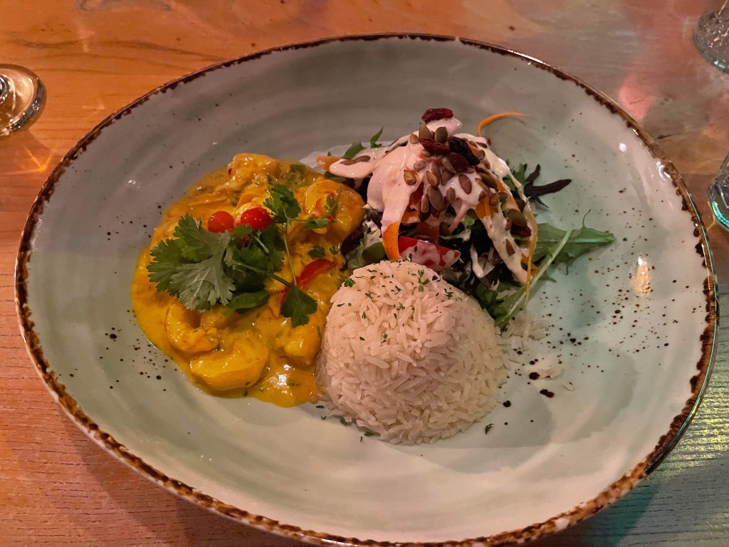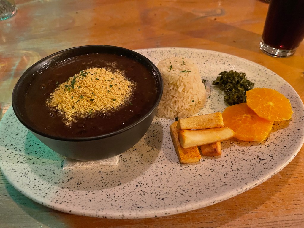 Ronnie also ordered this Brazilian soft drink that tasted like Red Bull without the caffeine. It was great. Then it was time for the mains. Ronnie ordered the Brazilian Prawn Mocqueca which is prawns with Brazilian Cachaca and Dende oil with smoked paprika, they were in coconut cream, vegetable and coriander with a side of rice and salad. This was a fantastic meal. Ronnie loved it. It really hit the spot for him. Aimee had the Feijoada which is a traditional Brazilian Smokey black bean stew with chorizo, pork ribs and bacon. She enjoyed it but said it was a bit too much of the same beans texture which became a bit much for her after a bit.
