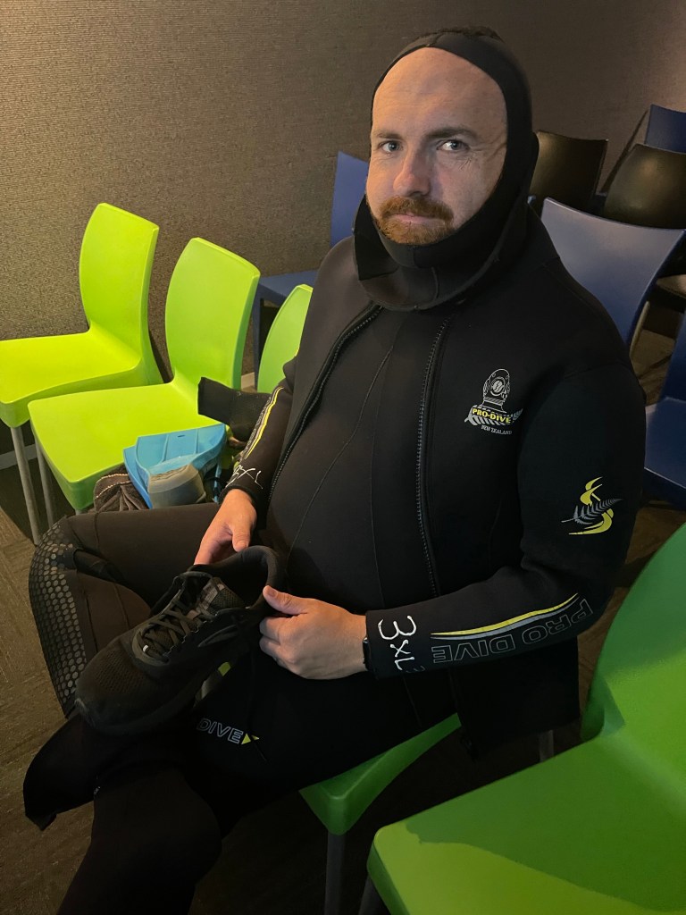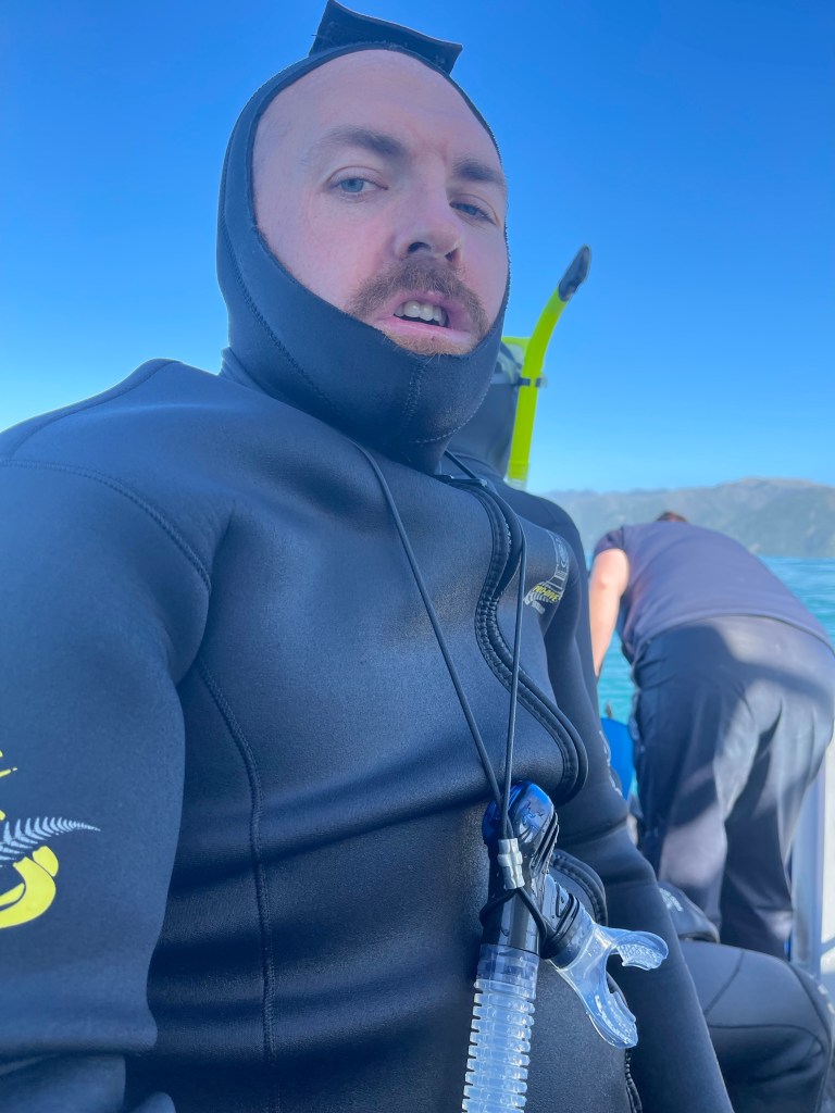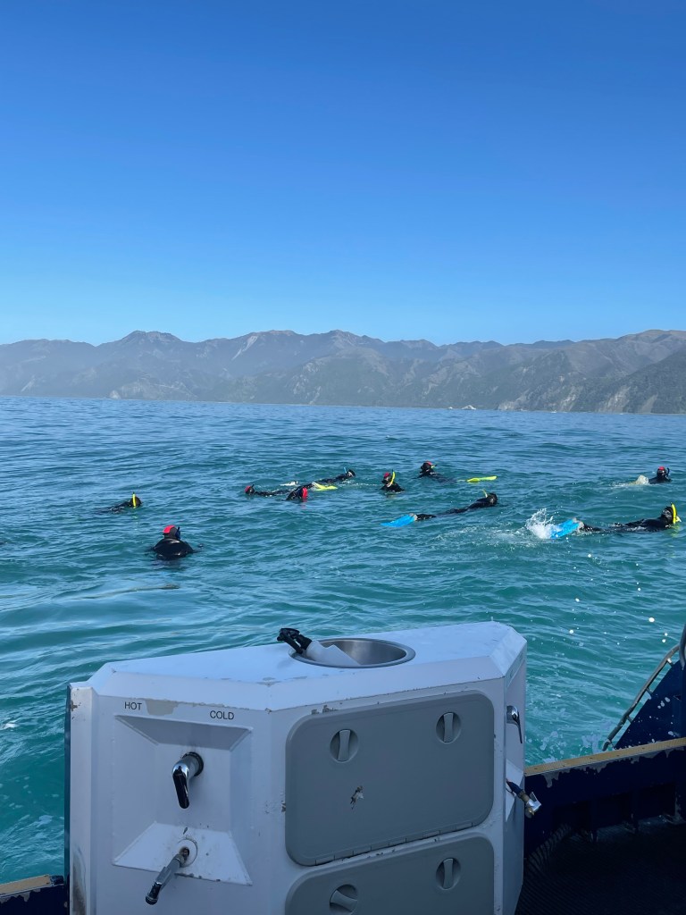 Our morning activity today was swimming with the dolphins. Kaikoura is the home to thousands of Dusky Dolphins year round and they love to interact with humans. This is a sustainable encounter as they are wild animals in the open sea. They aren’t fed or trained or captured or anything. Ronnie got his full swimsuit fitted and we watched a little safety briefing. They informed us that they had not yet spotted any dolphins (there is no guarantee dolphins would be found). They also informed us that because of the large amounts of rain and wind over the last week that the seas were moderately choppy and that there is a high likelihood of seasickness. Having not had seasickness in the past, we brushed this off.