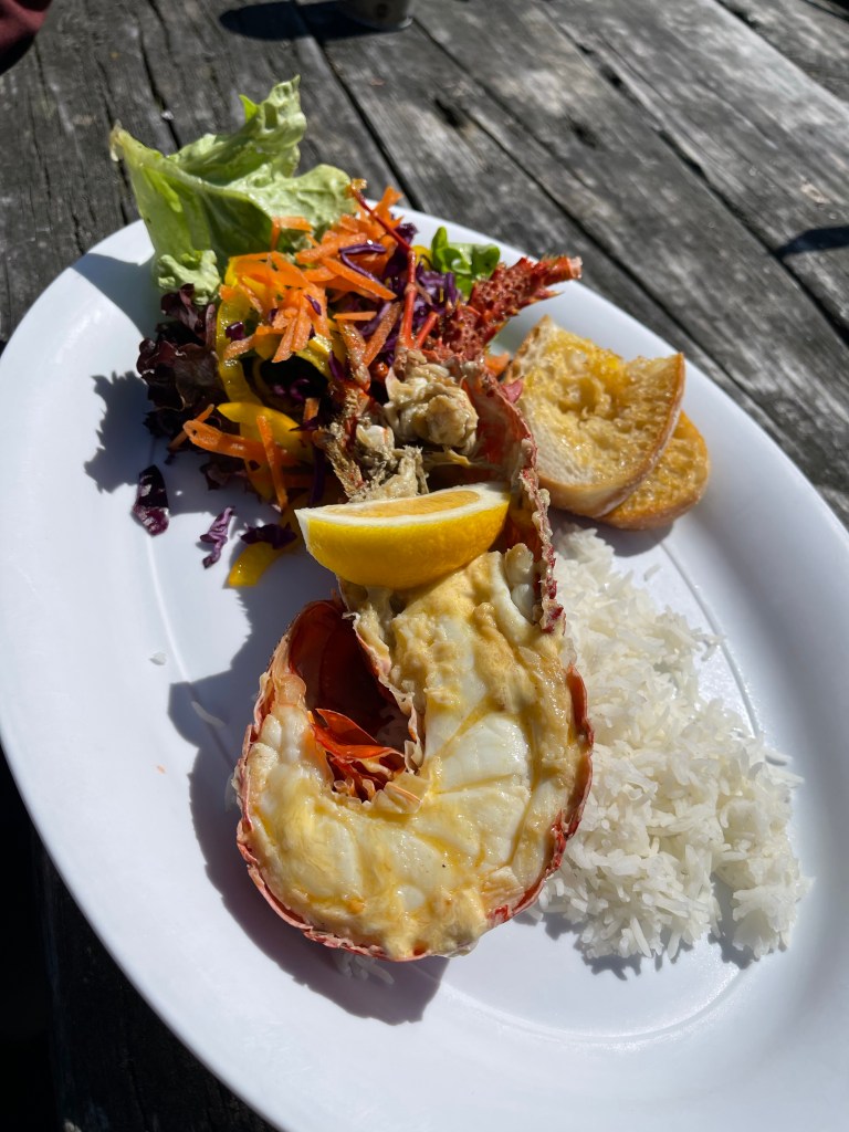 We walked down the road to our lunch which is called the Kaikoura Seafood BBQ Kiosk which is right near the seal peninsula and is a little kiosk off the rocks on the side of the road. The name of the town Kaikoura literally means “Eat Crayfish”. Of course we had to have a crayfish. We ordered a half crayfish which comes with rice, salad and garlic bread. It was actually quite delicious. Very similar to lobster but not as buttery. It went down a treat but was also a bit smaller than a lobster and as we shared it wasn’t much, but we don’t think we could’ve stomached much more.