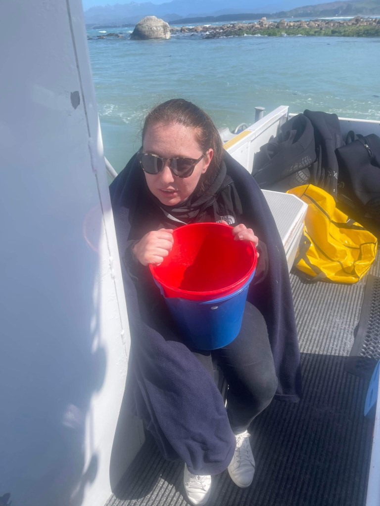 It was quite difficult to move around in the water as the swell was so large. There were two or three dolphins close by to Ronnie but he struggled to interact with them. Then we got called back onto the boat. Ronnie got back on the boat and saw Aimee was holding a bucket. She was incredibly sick and spent the rest of the hour and a half vomiting. About half an hour later Ronnie started vomiting too, as did 5-6 other people on the boat. This was the worst. We just really wanted to get back to land. After a couple more dips that we were unable to participate in and some photo opportunities we sailed back to land.