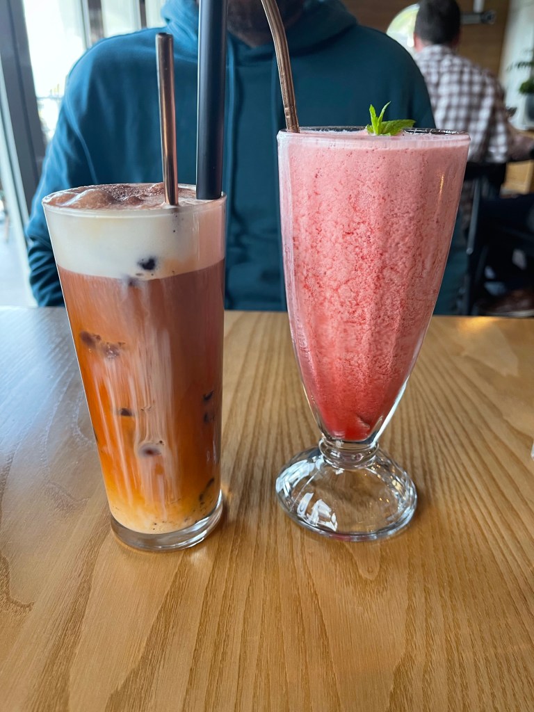 We also got some cool drinks. A Strawberry smoothie which was made out of some soda so wasn’t really a smoothie at all but was delicious and a thai milk tea which is always awesome.