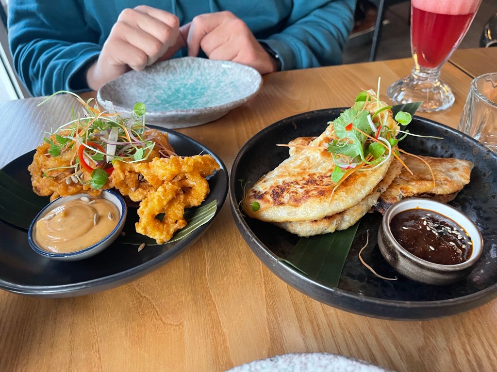 Our dinner was at a place called Namh – Thai with a twist. It was on the waterfront and we got seated at a table with a view which was nice. For entree’s we got some Roti with a sweet chilli jam and some tom yum calamari. The roti was good and the sweet chilli jam tasted delicious with it dipped into it. The calamari was good, but it wasn’t really any different from normal calamari rings. Why they called it tom yum calamari we don’t know.