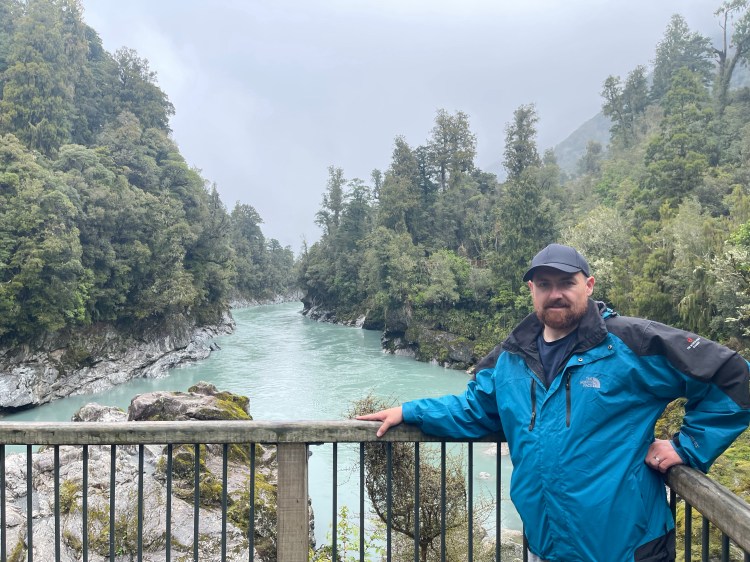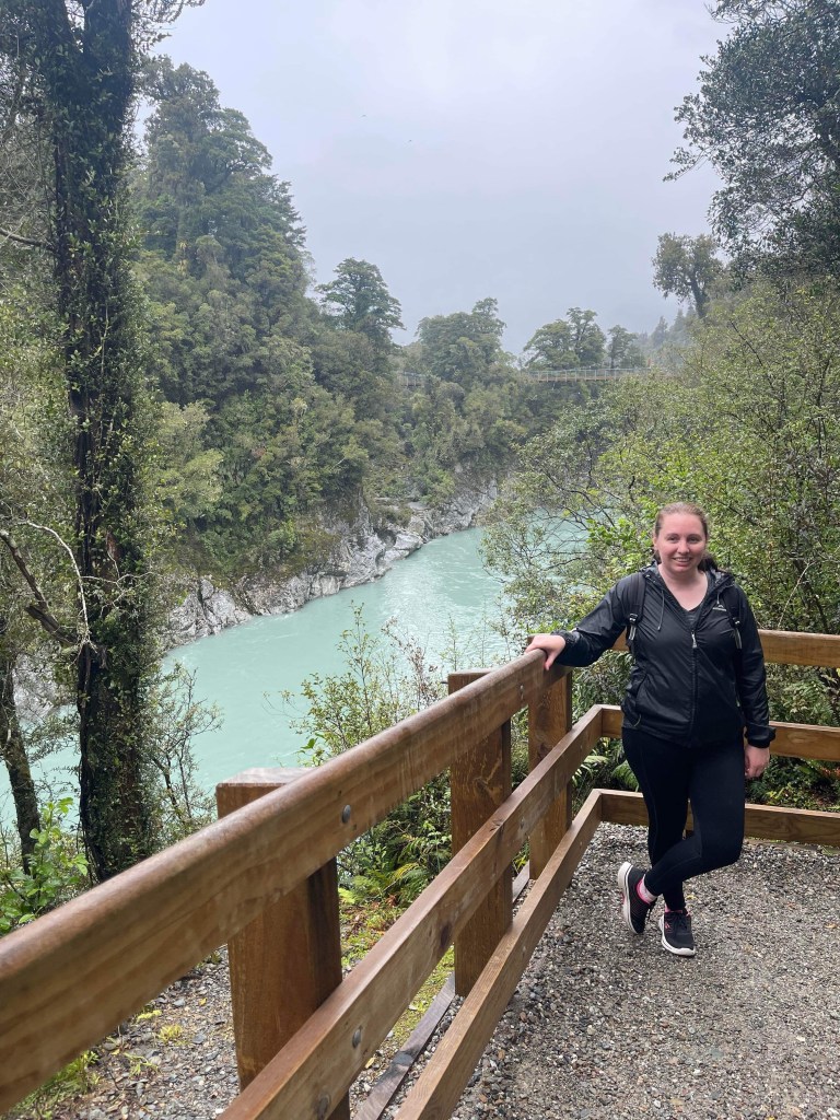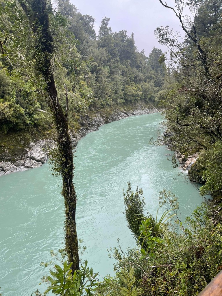 We arrived in Hokitika and dropped out bags into our hotel which was actually very nice and right on the beach then we jumped in the car and headed off to our activity. It was another half an hour drive to the beginning of the Hokitika Gorge walk. The landscape was crazy – it was farmlands with mountains behind it which was sky blue and clear in one direction and in the other direction is dark and rainy. We drove into the dark and rainy.