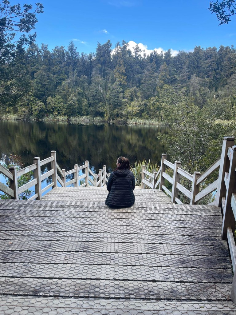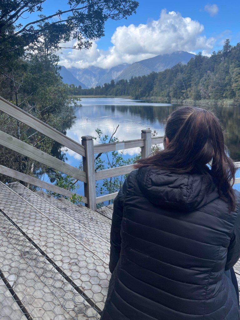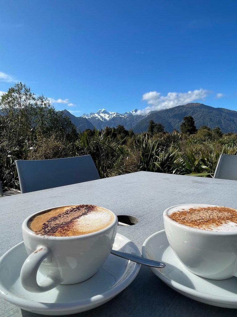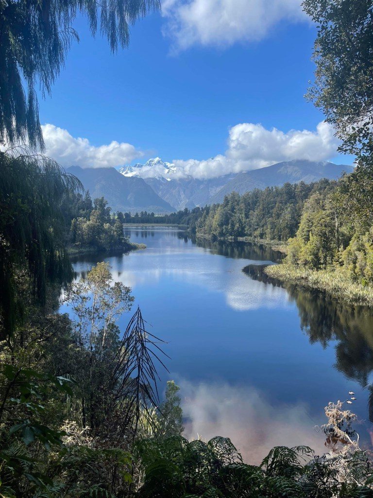 After that we strolled back to the car and drove straight to our next walk. It was about half an hour down very windy roads towards to Fox glacier. We weren’t looking at a glacier this time though. We arrived at the Lake Matheson walk. There is a nice little cafe at the start of the walk where we grabbed a coffee and marvelled at Mt Cook and Mt Tasman in the distance.