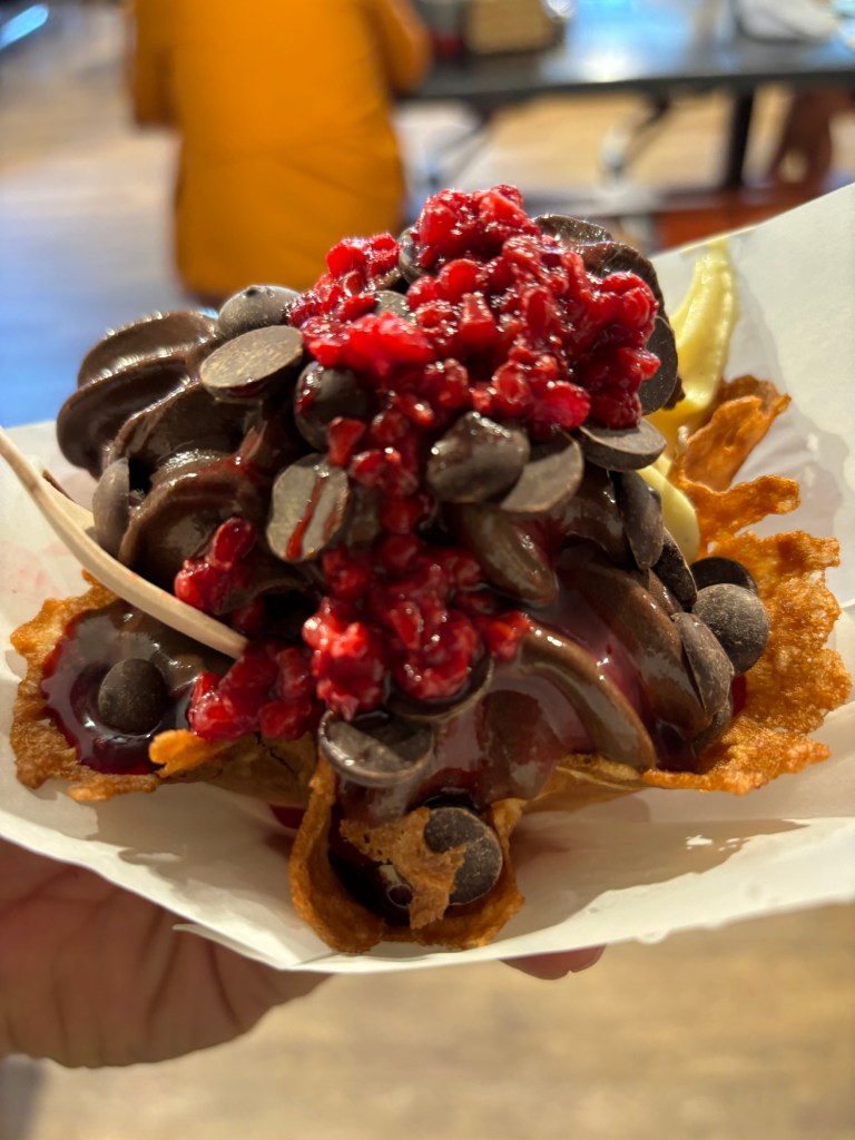 On our way out of town we stopped in at a very popular general store/gift shop/cafe. There was a sign out the front that said they sold gelato in a waffle cone bowl. This excited us as our last experience with waffle cone bowls in Dunedin was excellent. However, this time it was not as great. It was organic soft serve ice cream with organic chocolate and raspberry coulis on it. It was okay, but certainly nothing to go out of your way for.