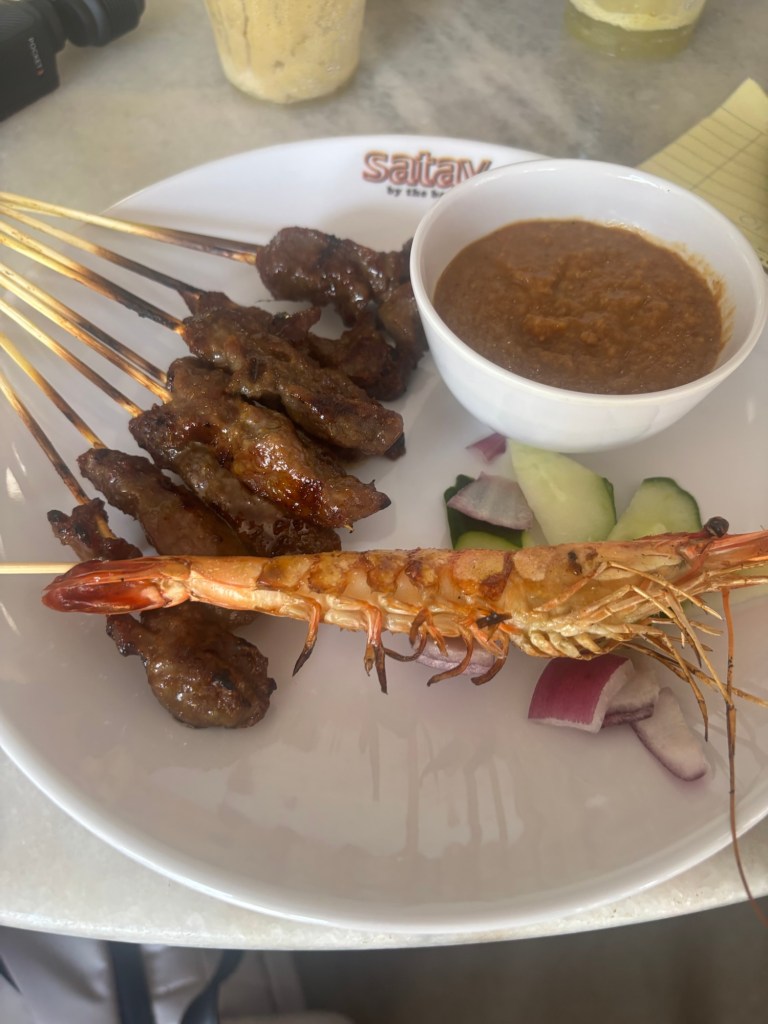 We were hungry to now so we headed to Satay for the Bay for satay of course. We got some nice cold fresh juices and ordered our first set of chicken satay skewers. These were great but then we went to another stall for beef skewers and the sauce was amazing from there. Julian had some prawn fried rice. That’s a guy that loves prawns!