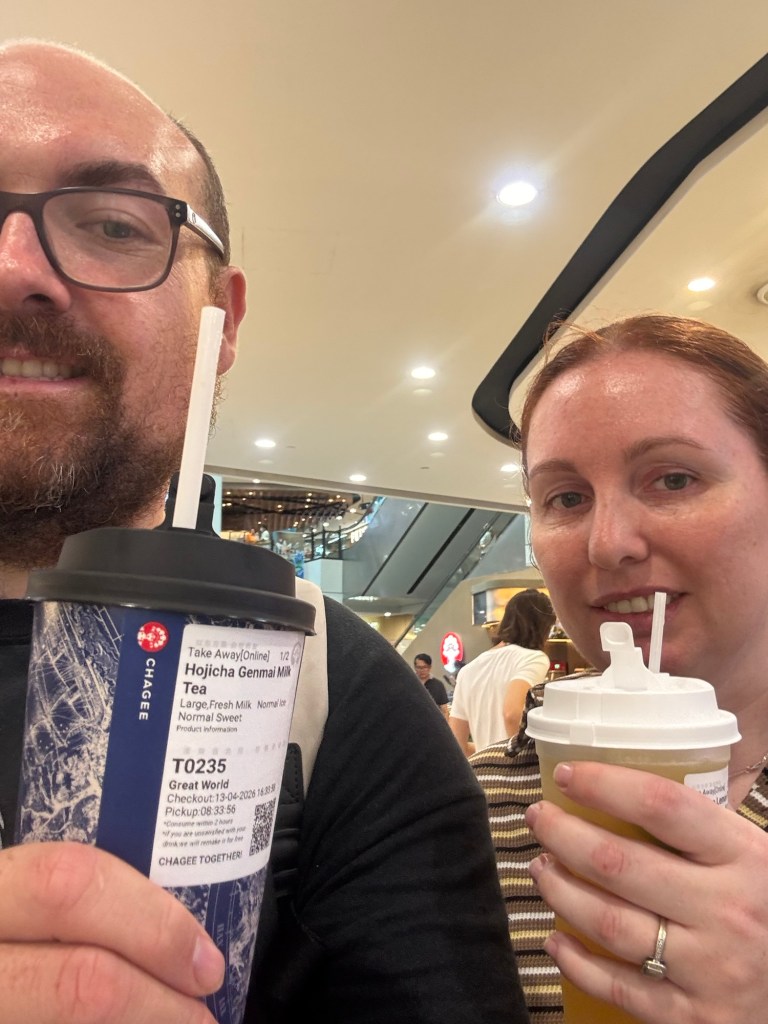 We needed to cool off and rest so we had a long walk to the best MRT station to get us home. Our legs were burning and we were sweaty messes. We stopped at Chagee at Great World for an artisanal cold tea. Ronnie got Hojicha Genmai Milk Tea which was delicious. Aimee had Lemon Jasmine Tea which was refreshing.